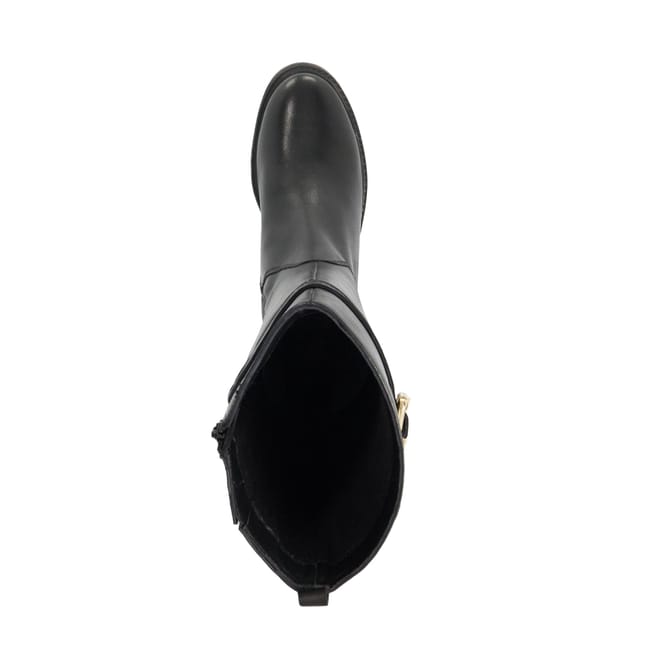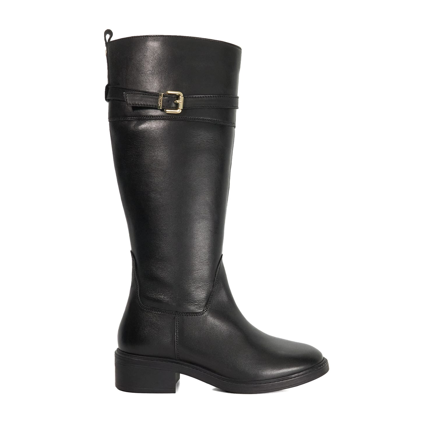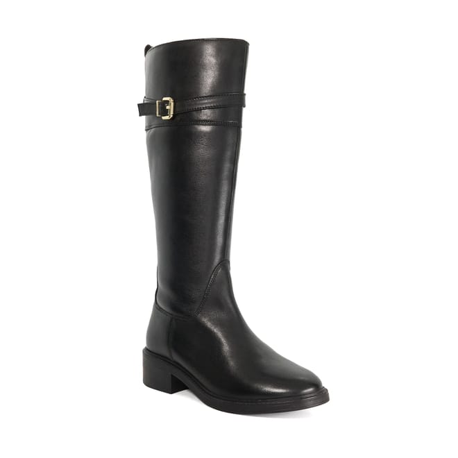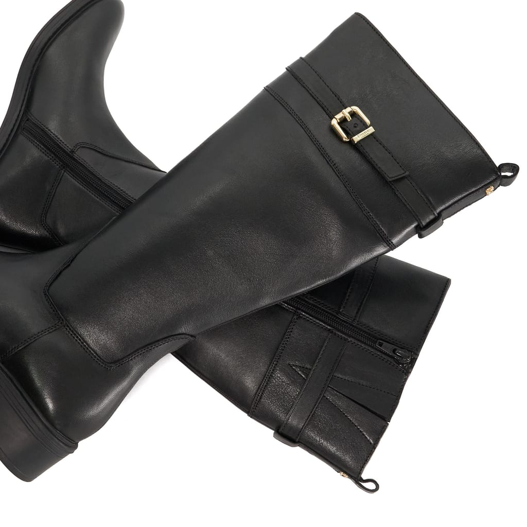 A modern classic Tilbi is the knee-high leather boot that blends timeless style with everyday wearability. Designed with a sleek round toe and refined seam detailing at the front it's finished with a belted strap at the top accented by a gold-tone buckle and signature branding. The low heel and inside zip offer comfort and ease while the rear pull tab ensures a practical touch. Smart yet versatile Tilbi is the perfect companion for both polished and casual looks season after season. -
