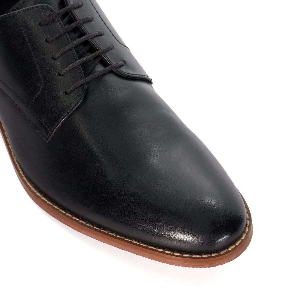 Solomon has been designed for the discerning dresser who values classic style. Designed in a rich leather this timeless Derby boast a sleek finish and exposed stitch detailing. The round toe silhouette is supported by a tasteful stacked heel. -