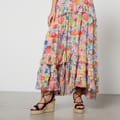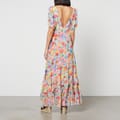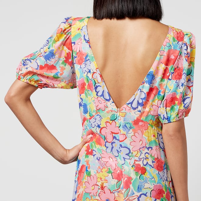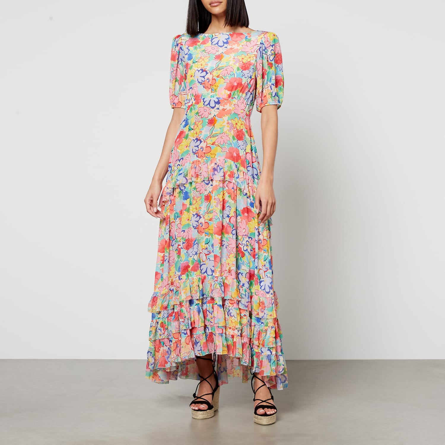 Round neckline. Short blousy/puffed sleeves with elasticated cuffs. Bias-cut ruffle skirt with a high-low hem. Concealed back zipper closure. Vibrant, vintage-inspired. All-over bright painterly floral print. -