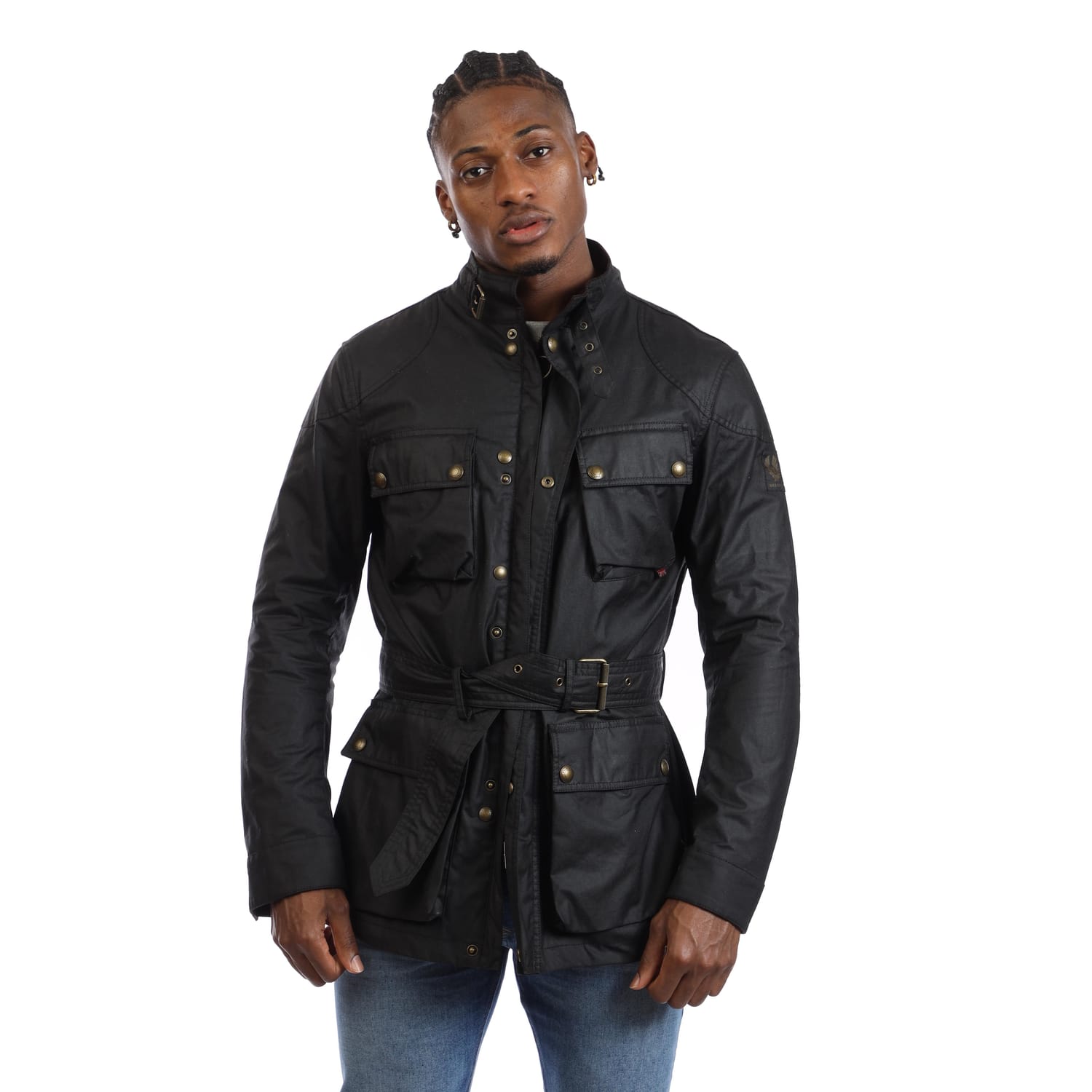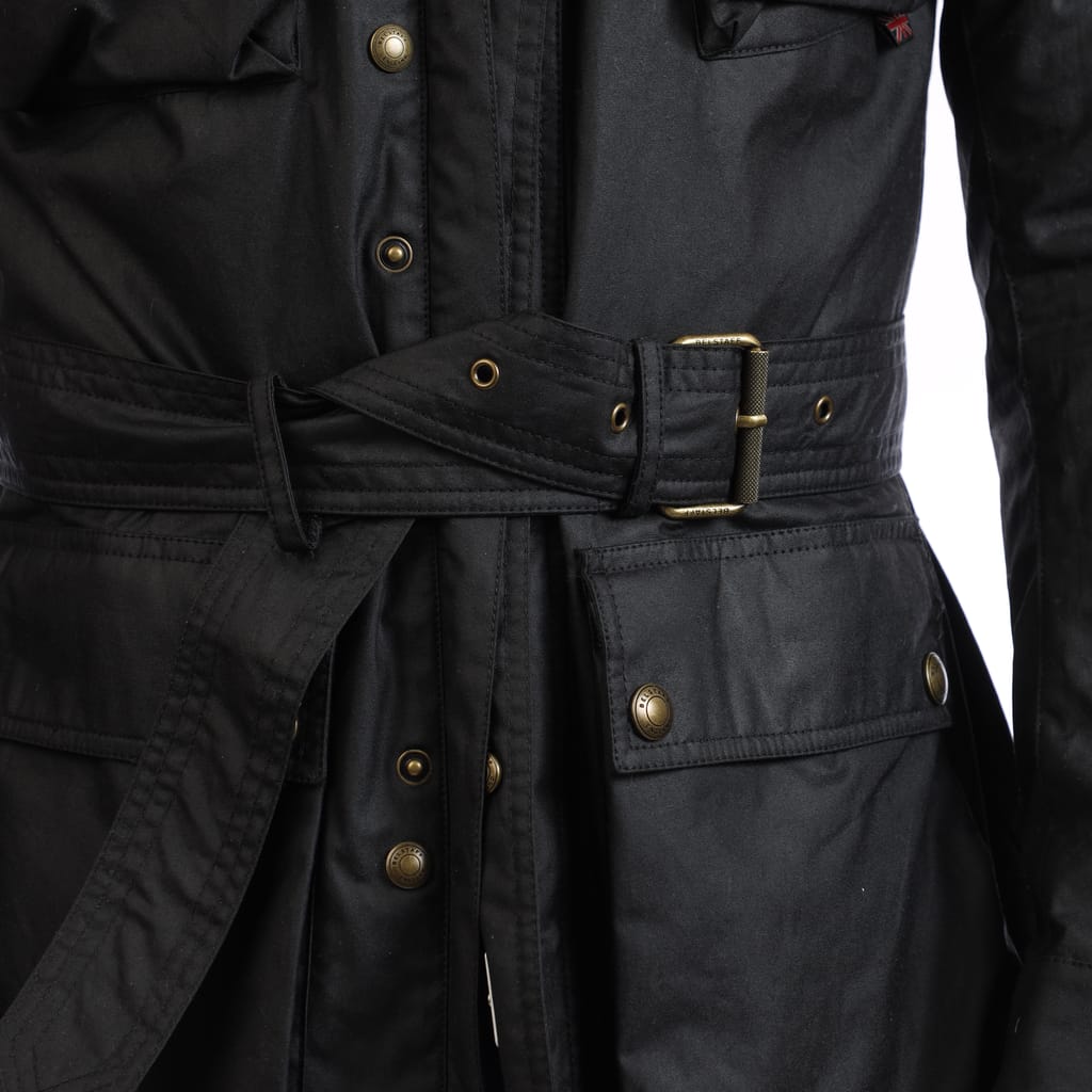 Features a classic four-pocket design with snap button closures, including the signature tilted left chest pocket. Includes a full front zip closure with a snap placket storm flap, an adjustable buckle-fastening mandarin collar, and an adjustable buckled waist belt. Features the iconic Belstaff phoenix logo patch on the left sleeve. Lined with the signature Belstaff checked cotton twill fabric, with corduroy lining on the collar and cuffs for comfort. -