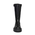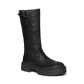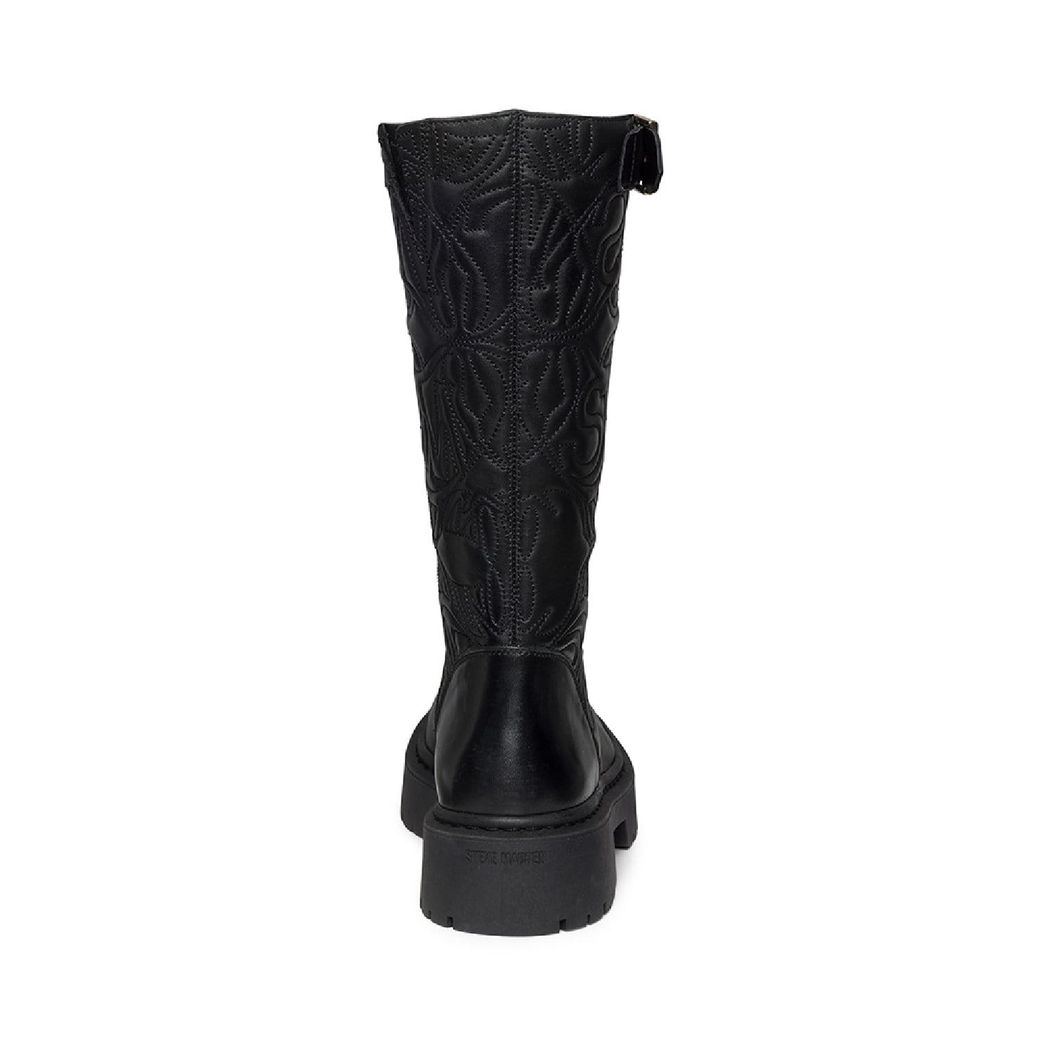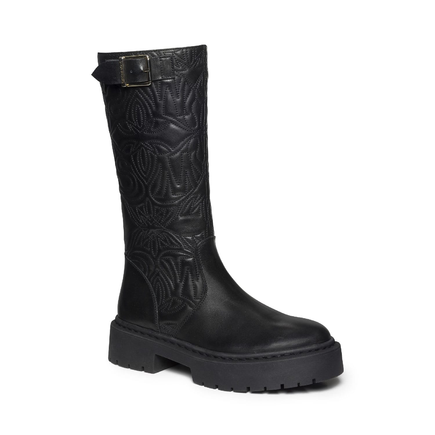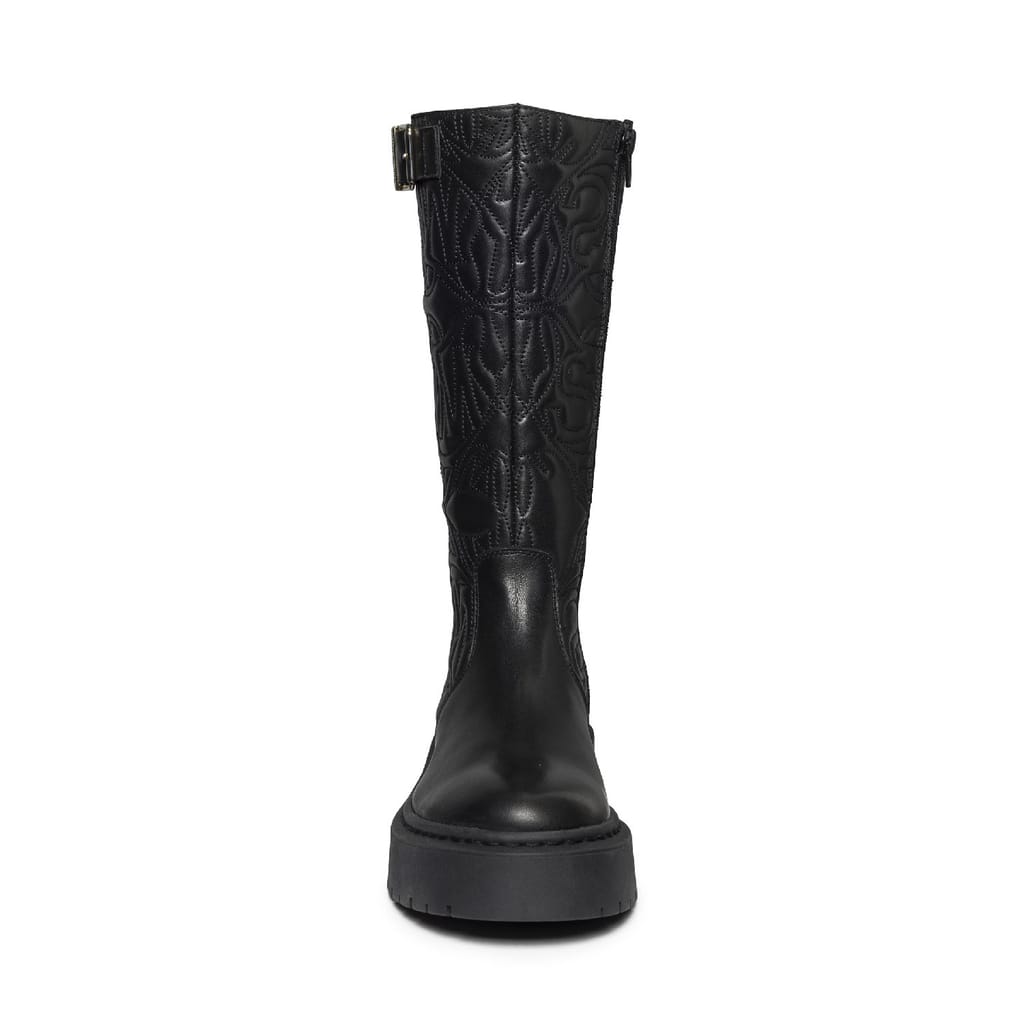 Leather upper. Zip closure. The boots are black leather with a platform and a block heel. They feature western-inspired embroidery and a decorative buckle strap at the top of the shaft. -