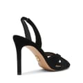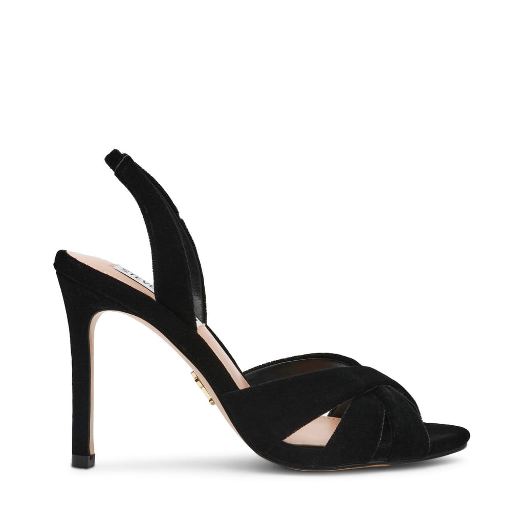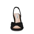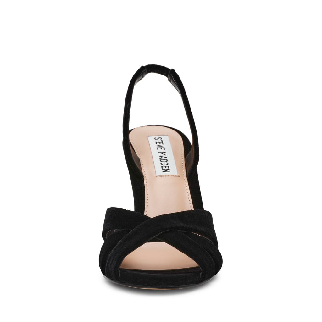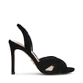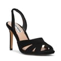 The item is a black high-heeled sandal with a stiletto heel. It has an open-toe design and a slingback strap with an elastic closure. The front of the sandal features criss-cross straps over the vamp. -
