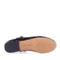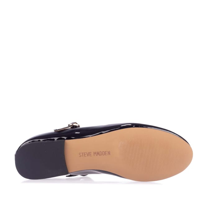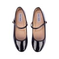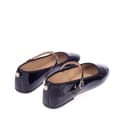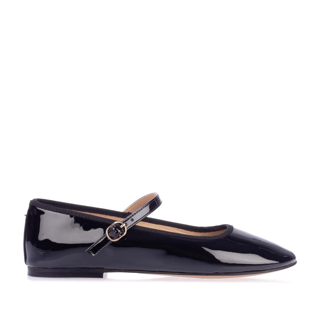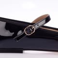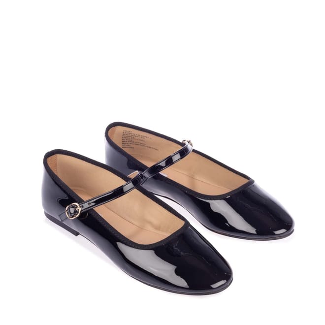 They are also described as a ballet flat with a strap and a pointed toe. The shoe is made from black patent PU leather and has an adjustable strap. -