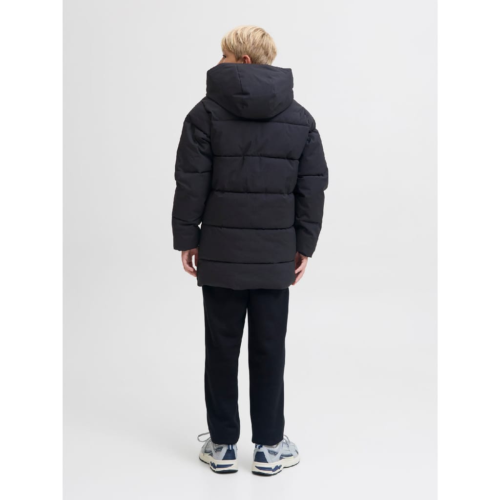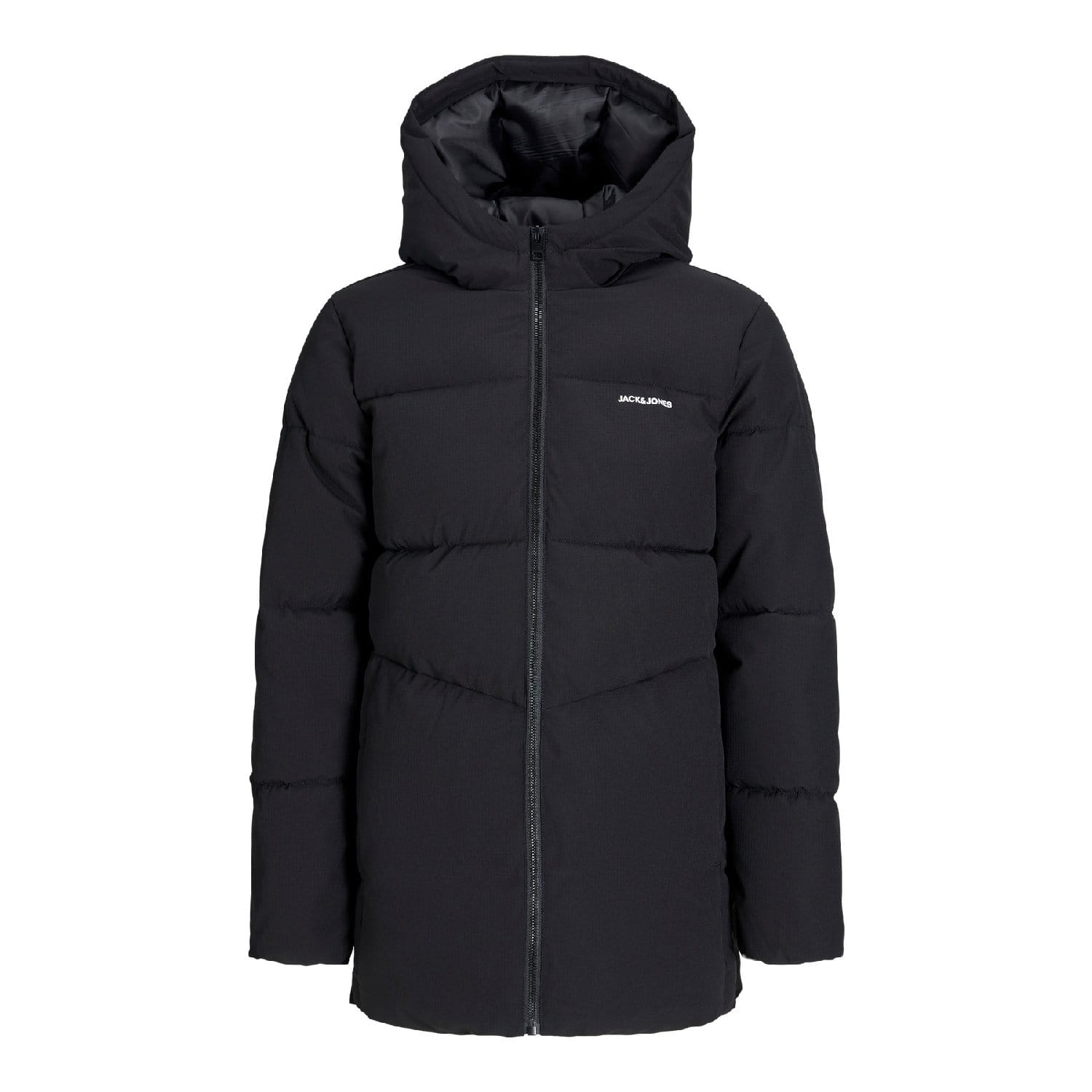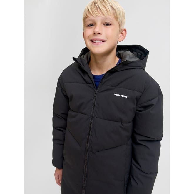 Boys Jack and Jones Brady Long Puffer Jacket in black.