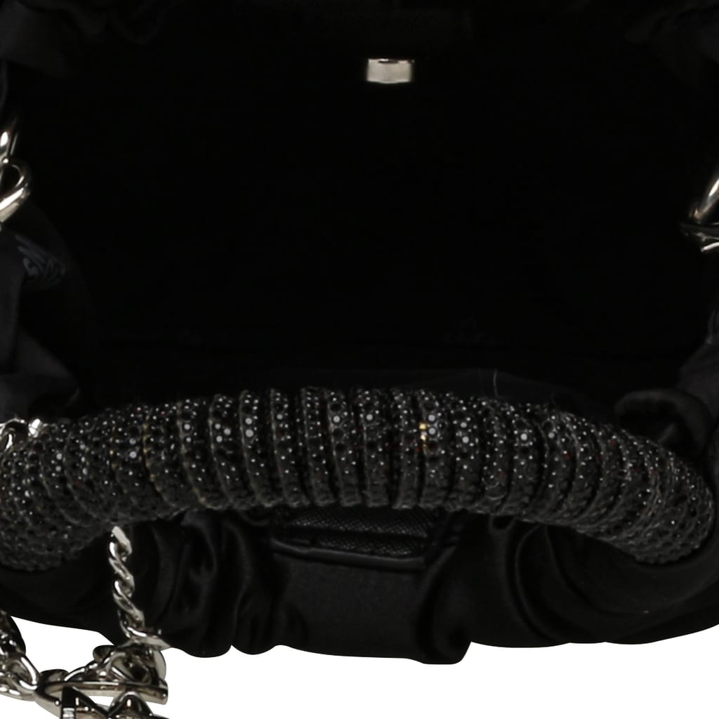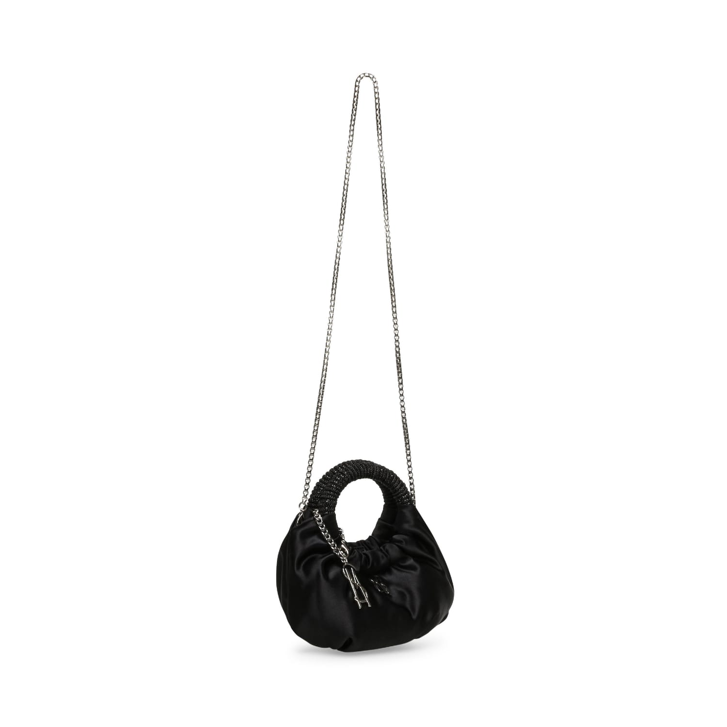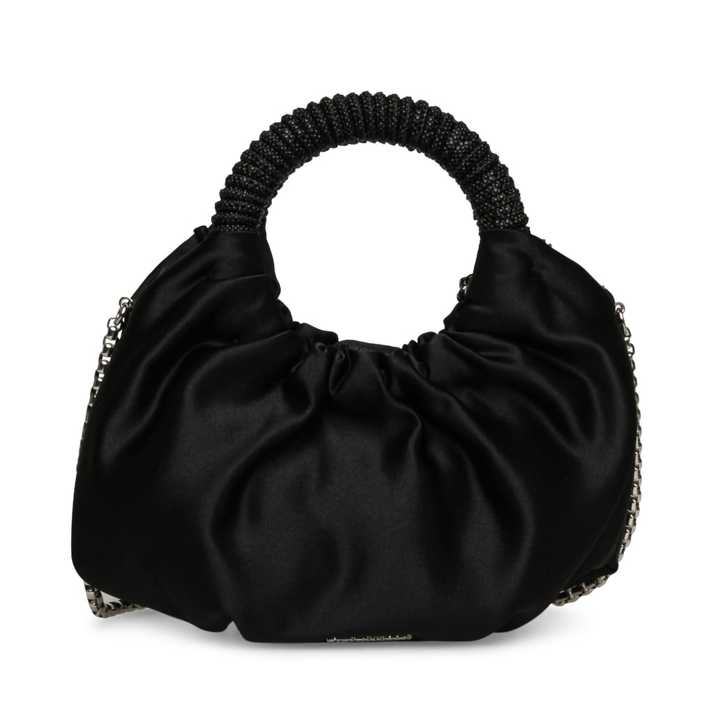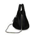 It features a ruched body, a rigid circle top handle, and a detachable chain crossbody strap. -