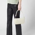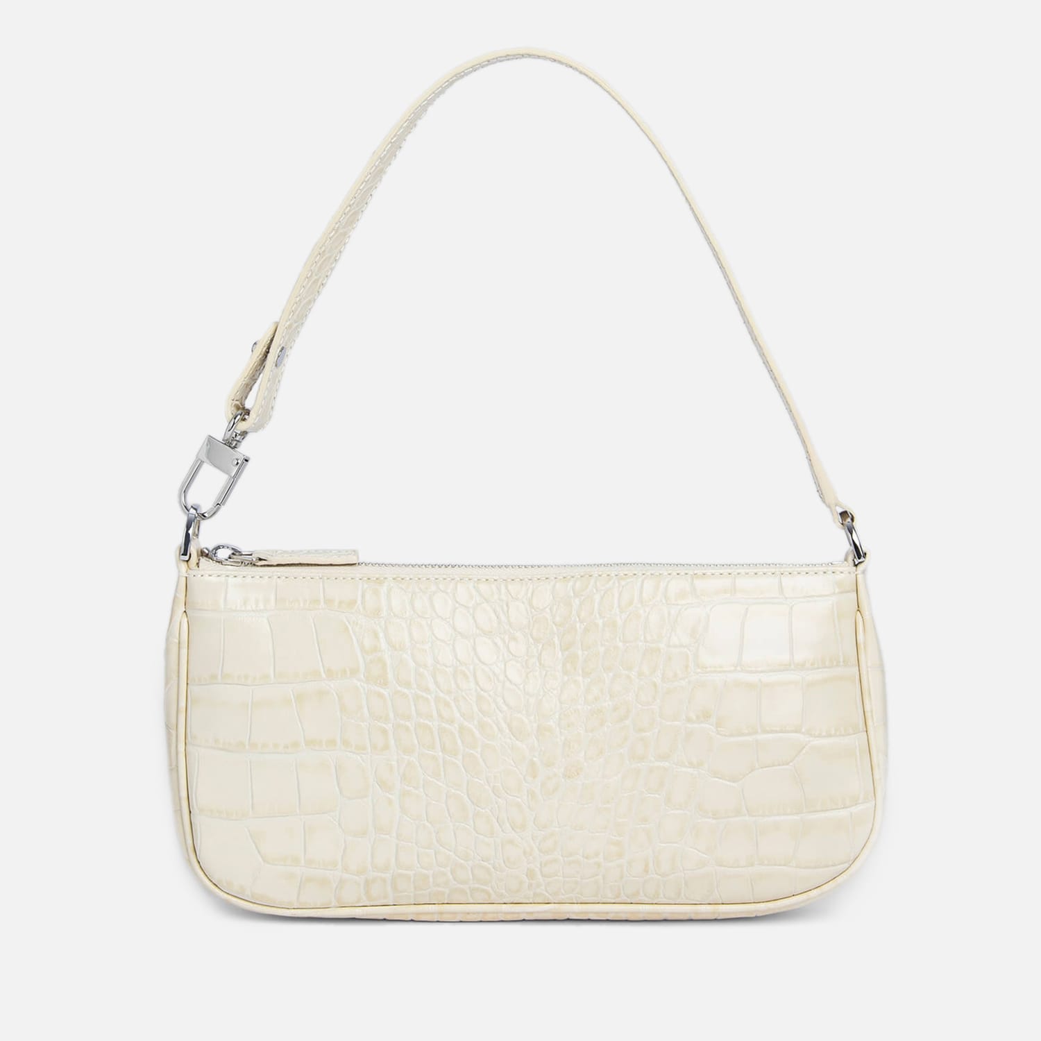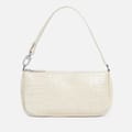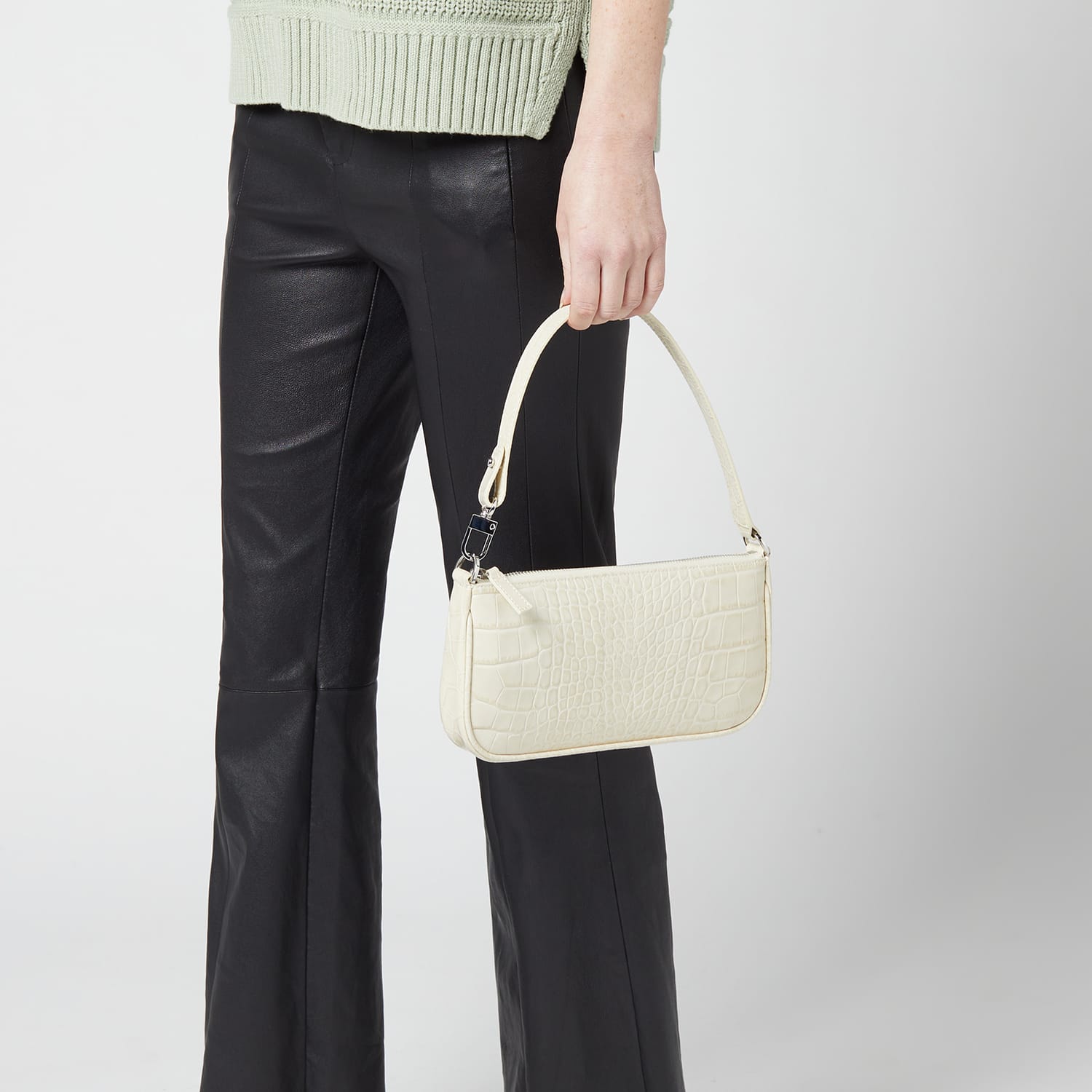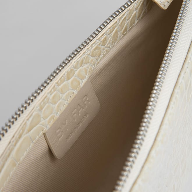 Top zip closure, slim design, and a shoulder strap. The strap is adjustable and can be detached to convert the bag into a wristlet. Croc-embossed leather with a cotton twill lining. Silver-toned hardware. -