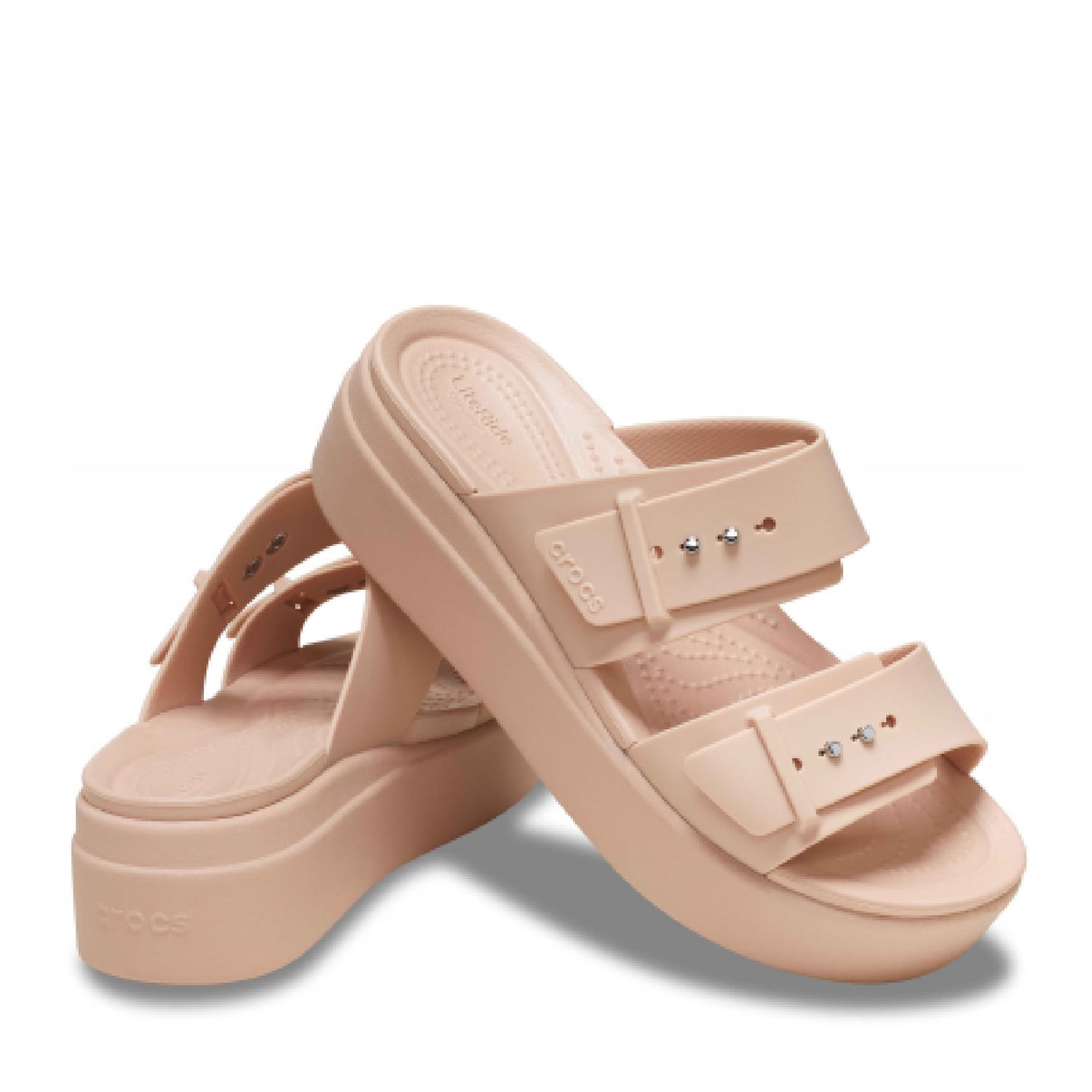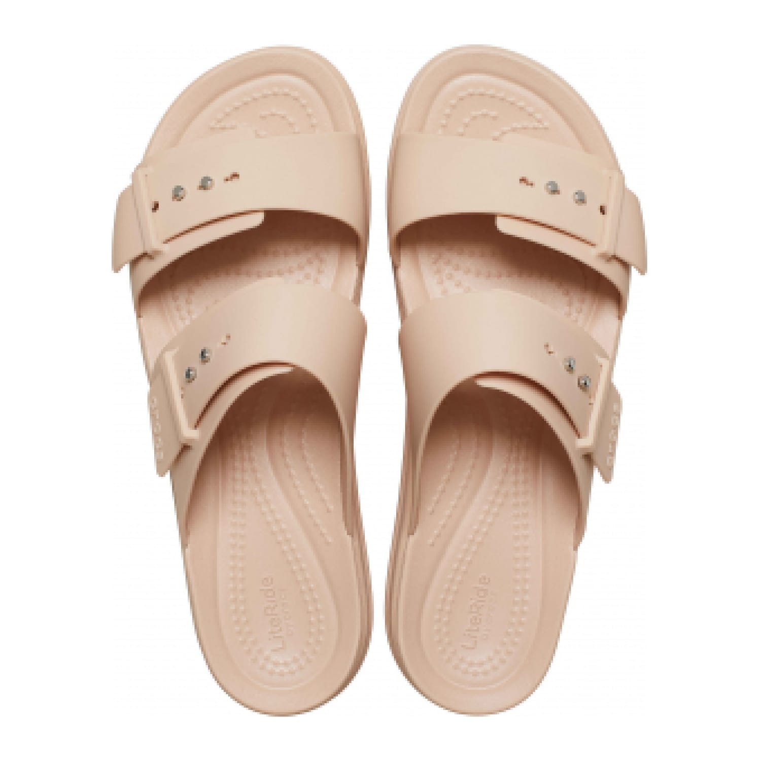 Made from flexible Matlite™ straps and a lightweight Croslite™ foundation. A stylish two-strap silhouette with two adjustable buckle points. Features revolutionary LiteRide™ foam insoles that provide sink-in softness and cushioning. Includes deep heel cups and a raised insole profile for added arch support and stability. A low wedge heel measuring approximately 47 mm (1.8 inches). -