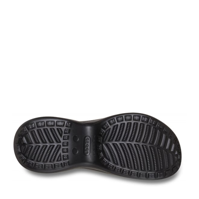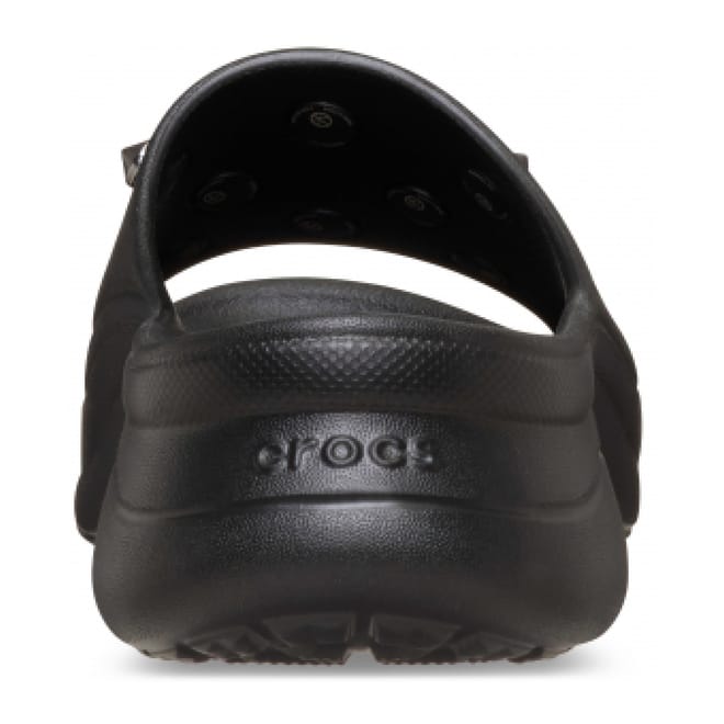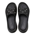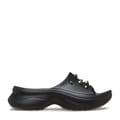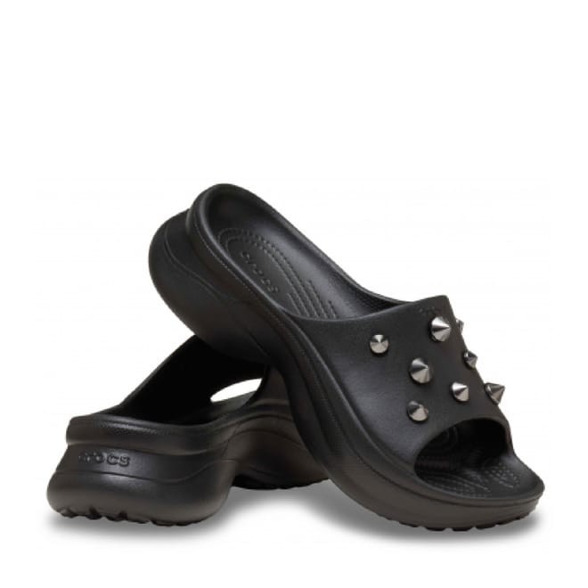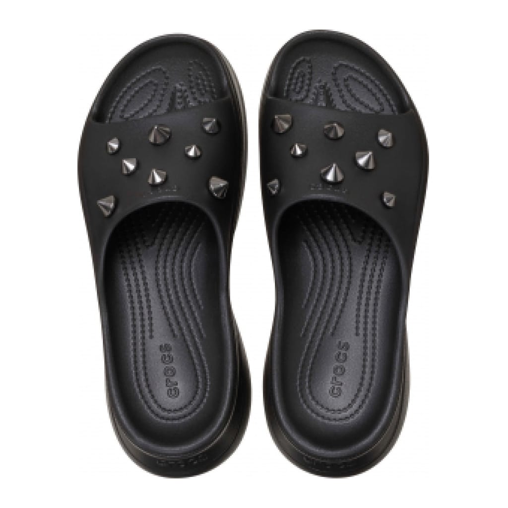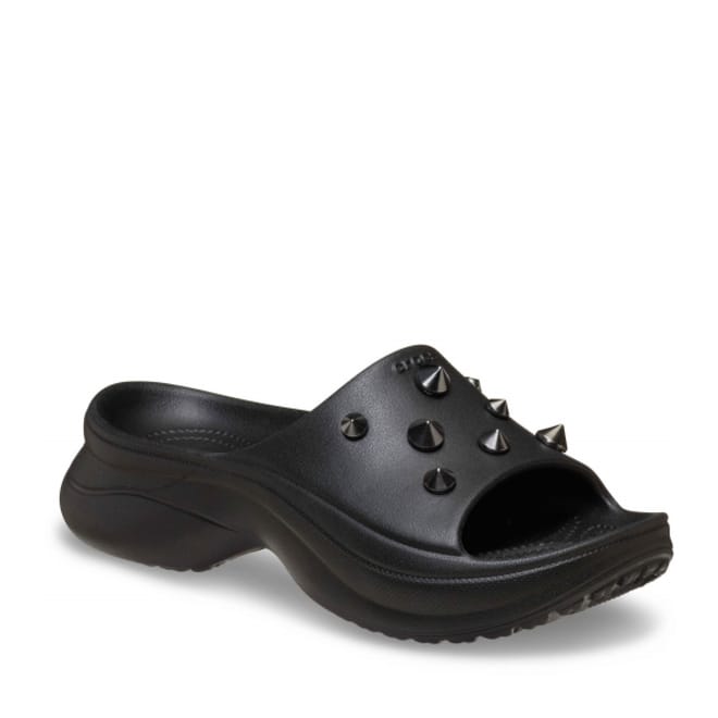 The upper is designed to hold Jibbitz™ charms, allowing for personalization, though this specific version includes metallic studs. Slip-on platform slide sandal with a bold, feminine style. Black with metallic silver stud embellishments. Features a unique 40mm (approx. 1.5-inch) height, measured from the floor to the heel rest. Made from lightweight and flexible Croslite™ material, providing 360-degree comfort. -