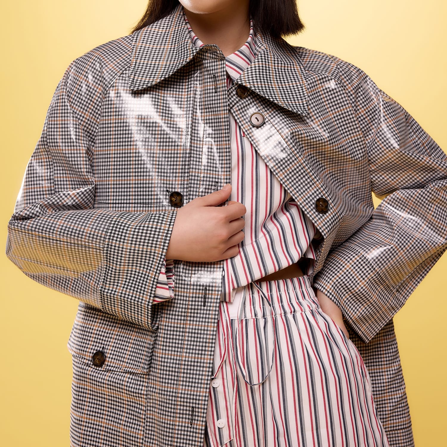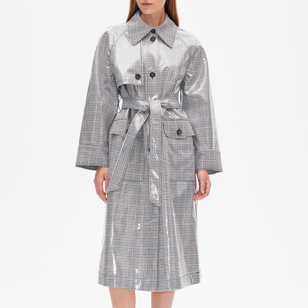 Classic collar. Button-down collar. Front pockets. Tie belt. Check pattern. Waterproof. -
