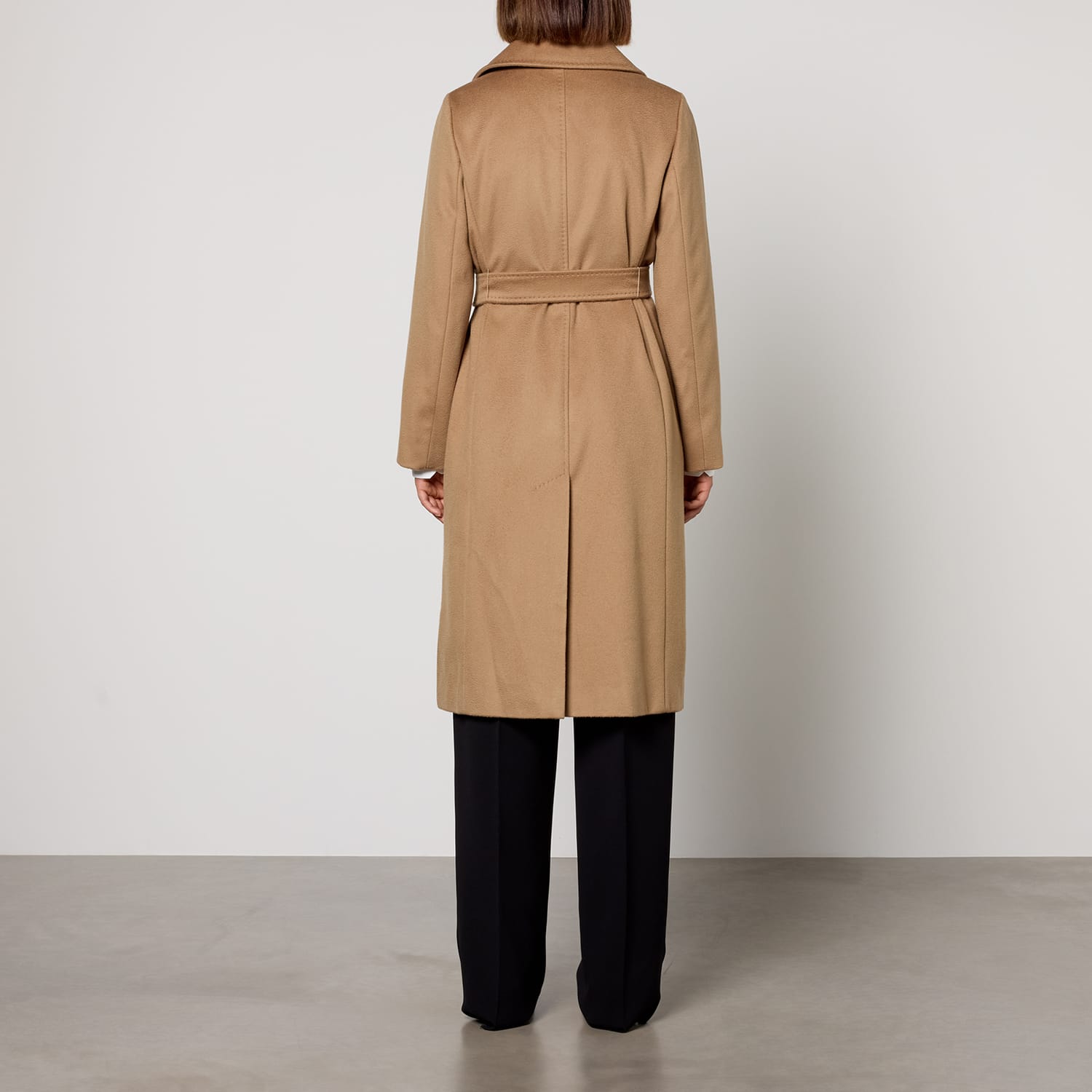 This long, double-breasted robe-inspired Max Mara coat features long sleeves, side pockets and concealed buttons with matching belt at the waist. Featuring a double function pointed collar to be worn open with lapels or fastened with button. -