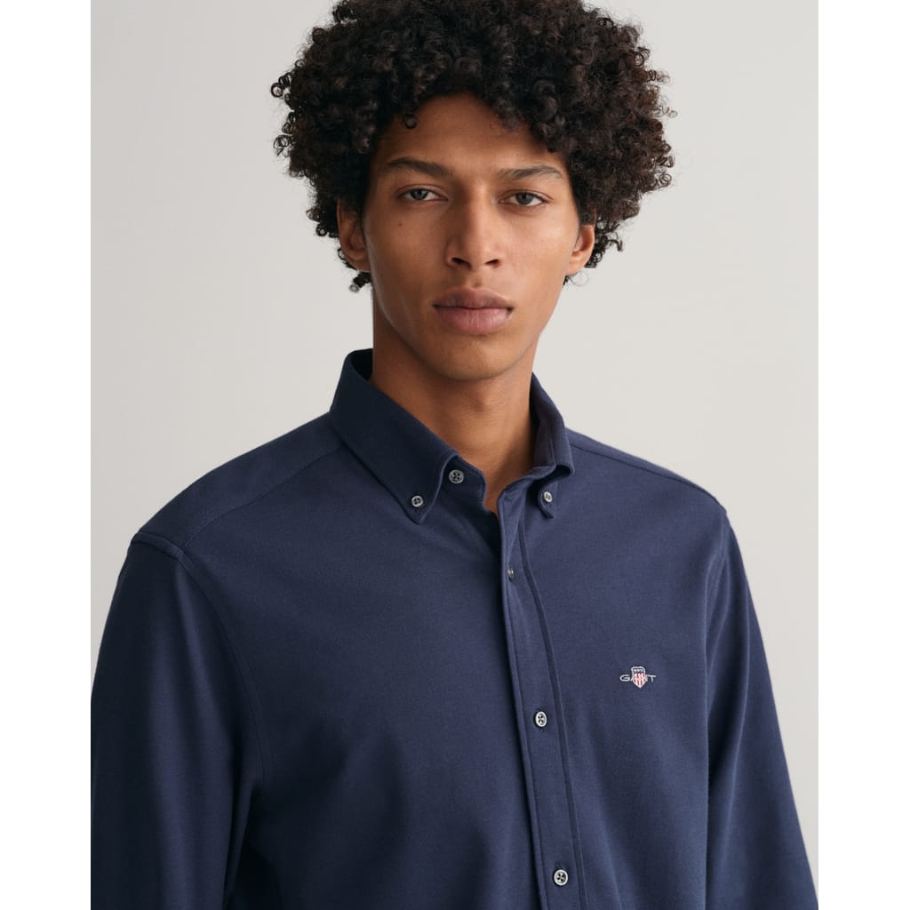 - Crafted from cotton jersey with a piqué knit texture, this regular fit shirt features classic detailing like a button-down collar, a locker loop at the back and our signature Archive Shield embroidered at the chest. Perfect for your working wardrobe and beyond, style with jeans and chinos alike.