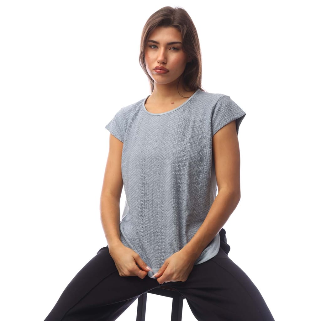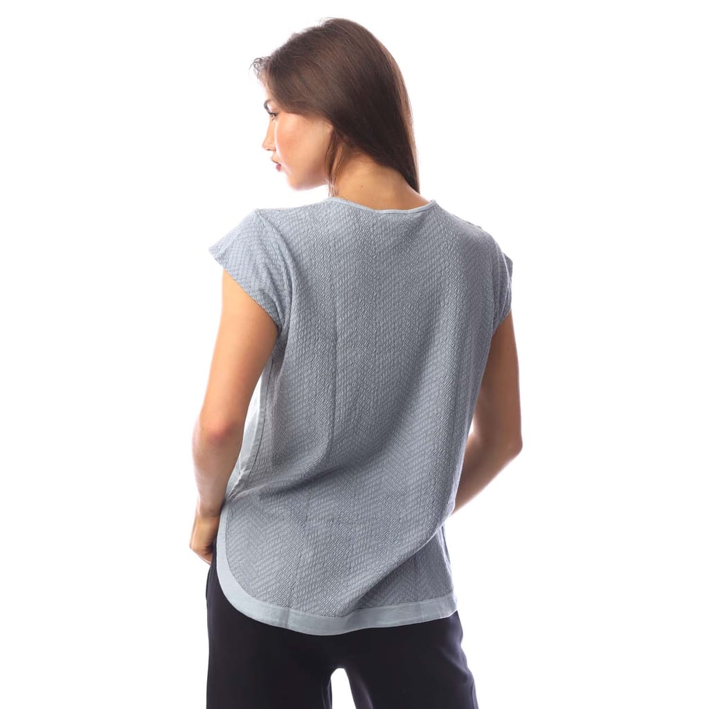 Round neck. Cap sleeves. Curved hem. Small side slits. -