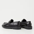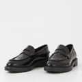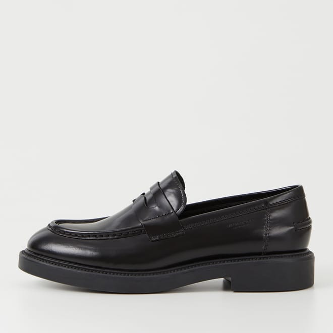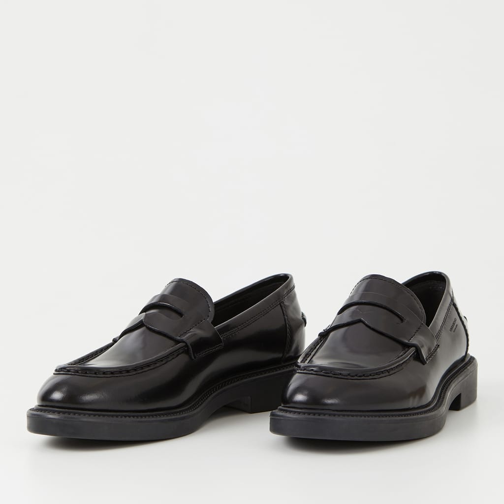 Alex W is the everyday penny loafer, crafted from smooth black leather and featuring moc toe detailing. The almond toe shape is accompanied by a traditional penny slot across the vamp. The rubber outsoles measure 33 mm. -