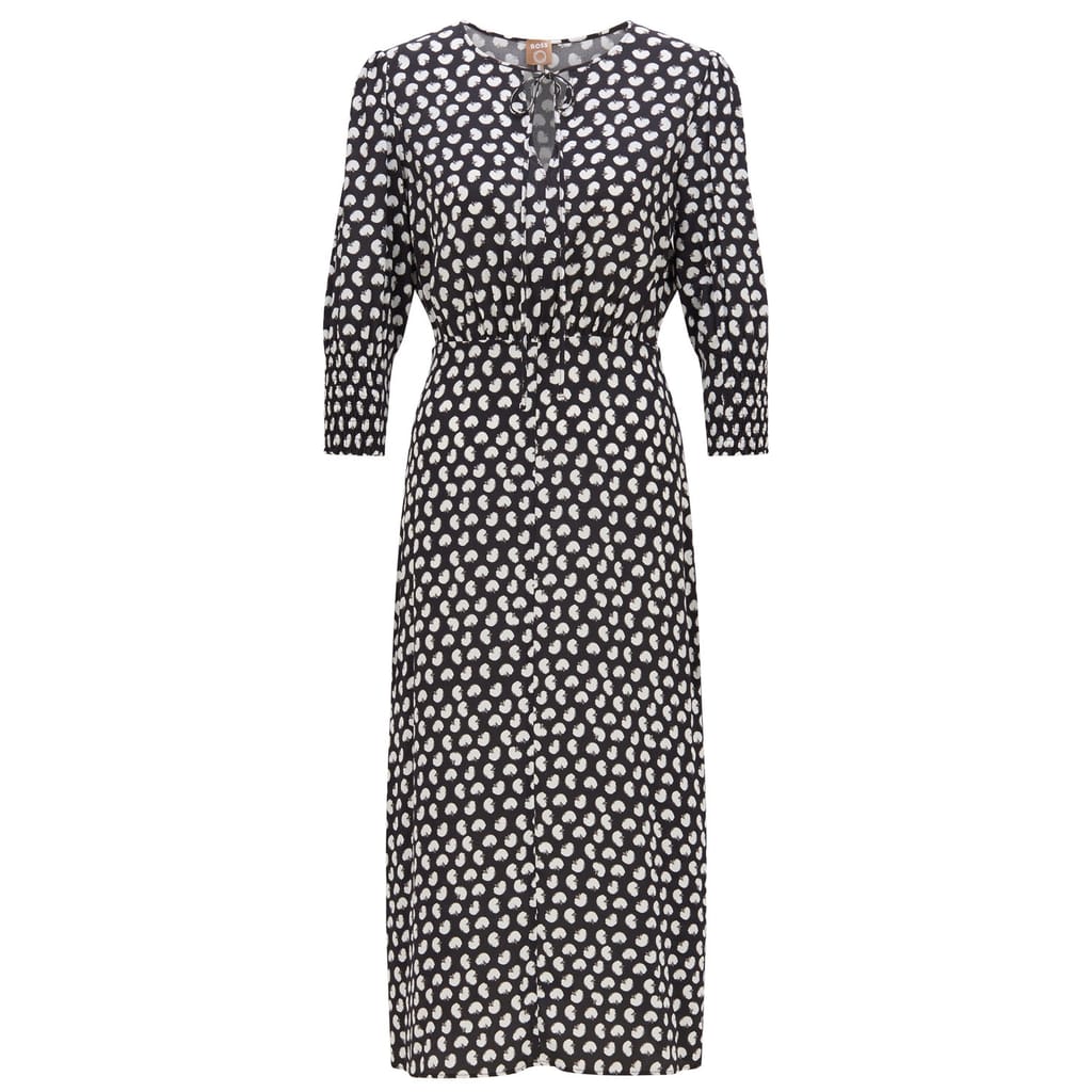 feminine dress with voluminous sleeves with smocking detailing / gathering at waist for feminine look / iconic stripe flag / 100% viscose / dry clean -