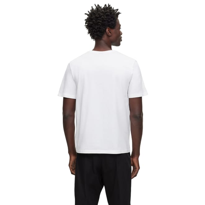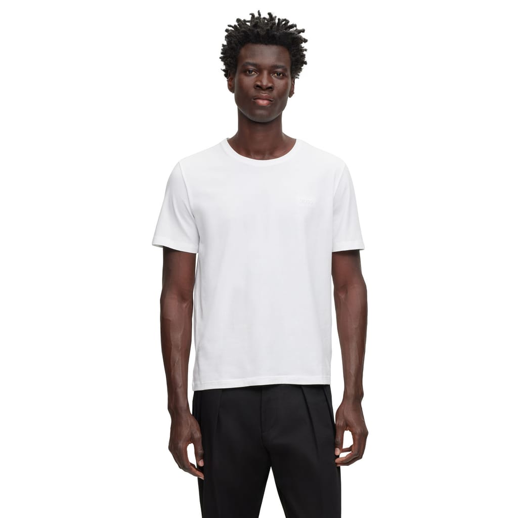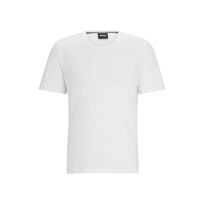 An easy-wear T-shirt by BOSS Menswear. This loungewear T-shirt is cut to a regular fit in soft cotton blended with stretch and features a contrasting BOSS logo at the left chest. The inner collar carries a signature stripe for an attentive finish.