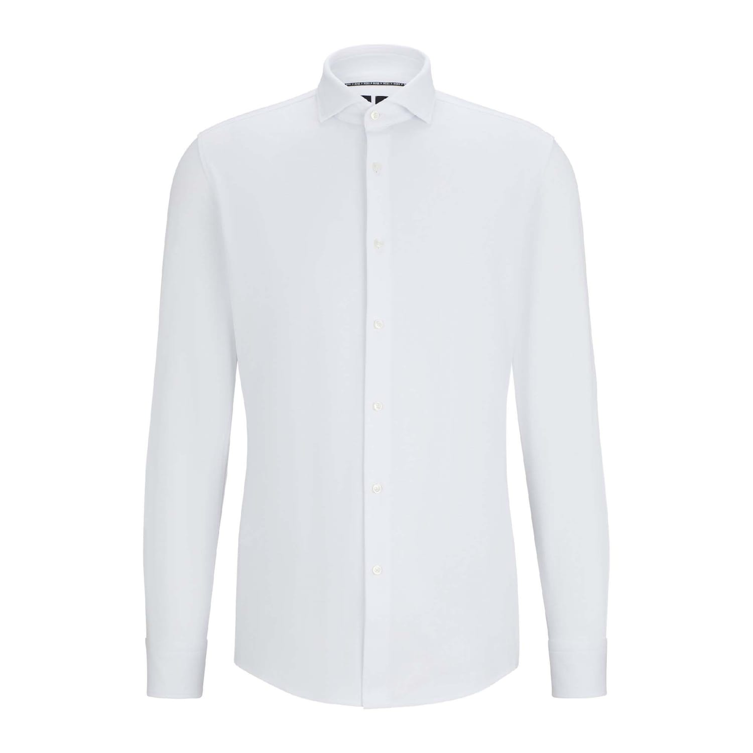 A long-sleeved shirt tailored to a slim fit by BOSS Menswear. Featuring a micro structure for a rich look, this modern shirt is crafted in a cotton blend with performance-stretch qualities for easy movement. Piping adds an attentive touch at the inner collar.