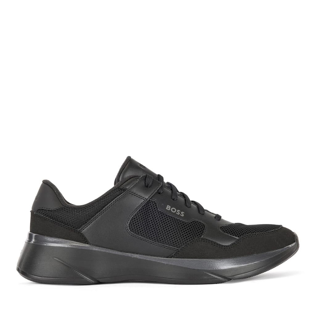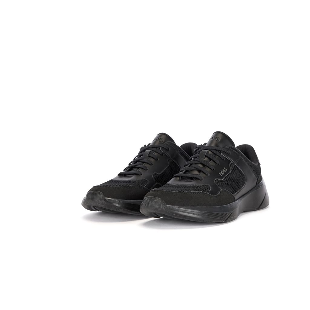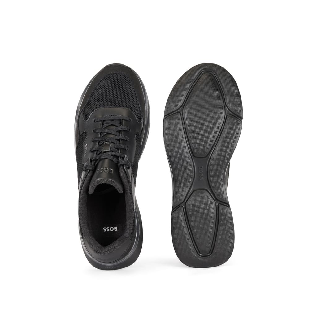 New BOSS active inspired sneaker. Lightweight EVA sole enriched by colour contrasting colour line that goes around the shape of the shoes. Mix material upper design: mesh and fly leather that assure a sporty appeal. -