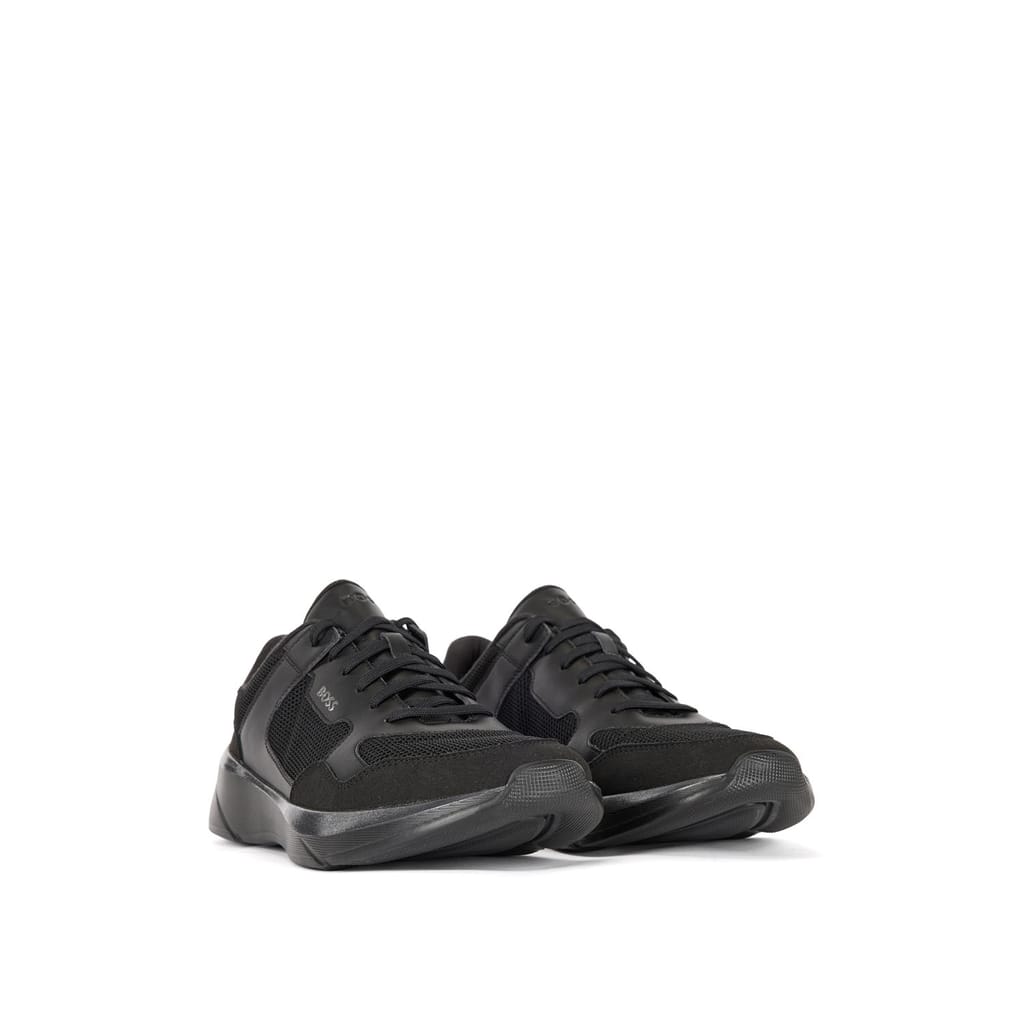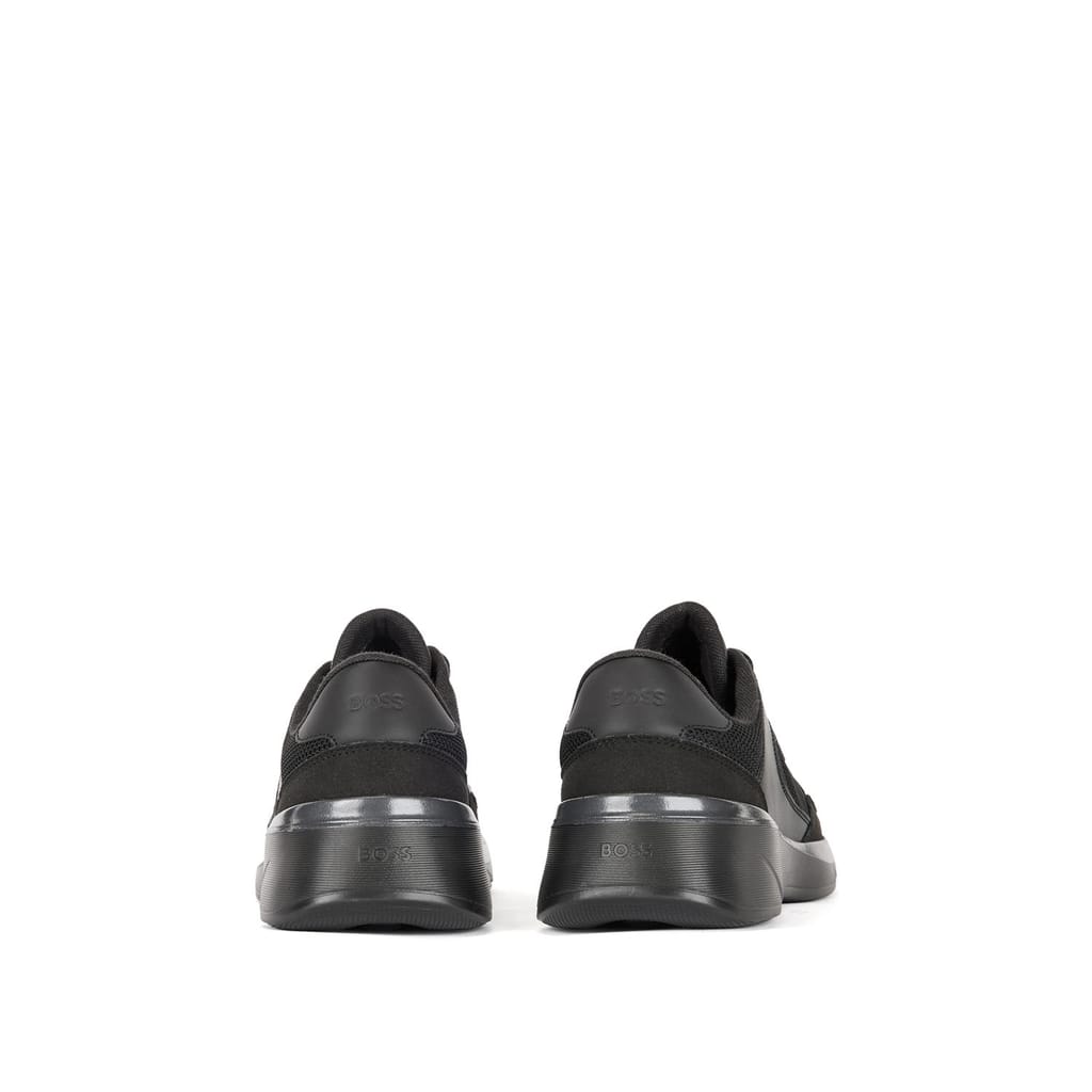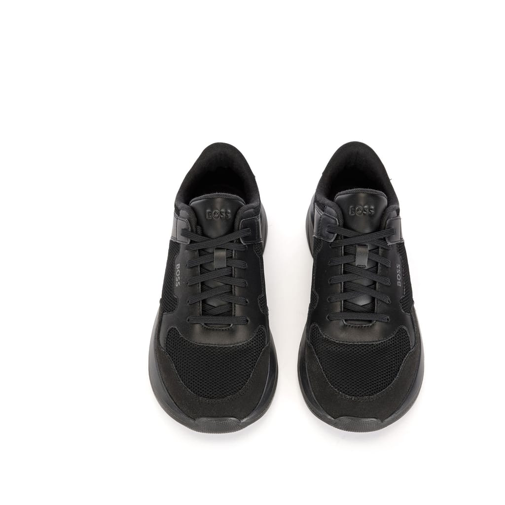 New BOSS active inspired sneaker. Lightweight EVA sole enriched by colour contrasting colour line that goes around the shape of the shoes. Mix material upper design: mesh and fly leather that assure a sporty appeal. -