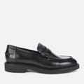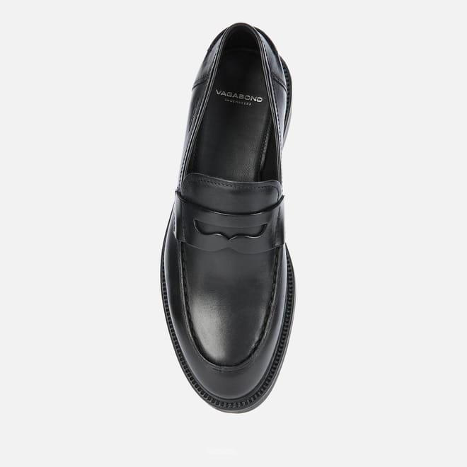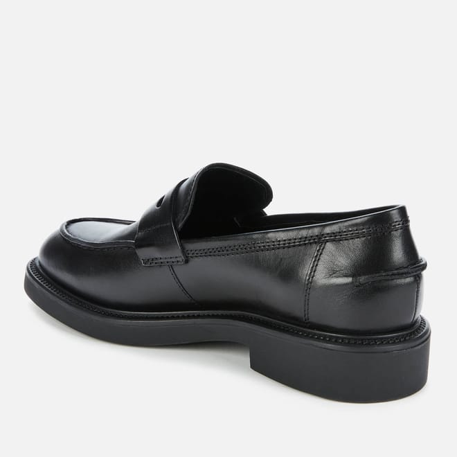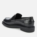 They are made from polished black leather and feature a moc-toe design with a traditional penny slot across the vamp and visible stitching. The loafers are designed for everyday wear and have a cushioned leather insole. -