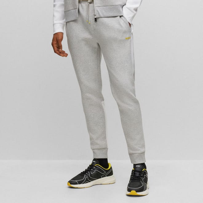 jersey trousers with cuffed hem and side tape (special 3D layout with integrated logo on one side) / contrast printed HD BOSS logo on left leg / special sporty drawstring execution -
