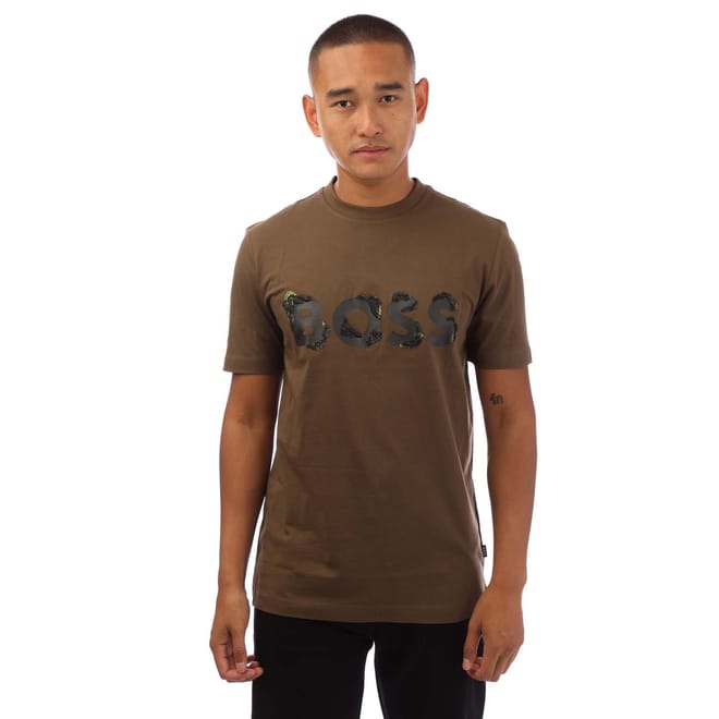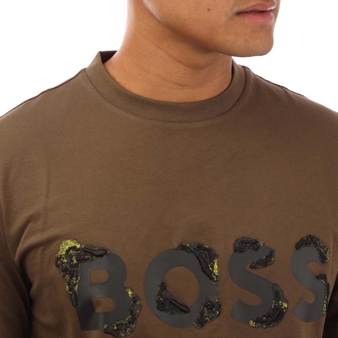 Mens BOSS Tiburt 42 Cotton Jersey T-Shirt with printed and embroidered branding in open green.