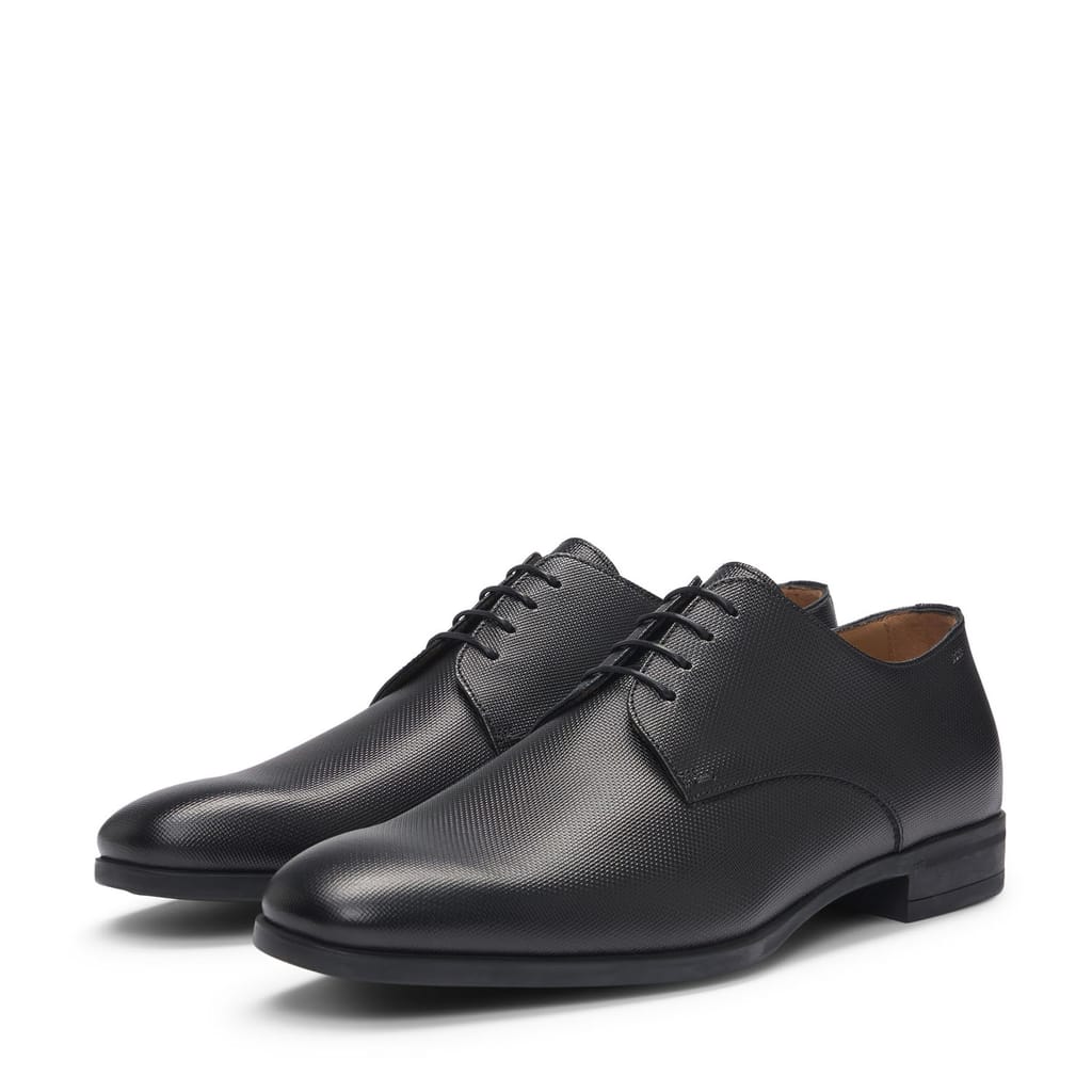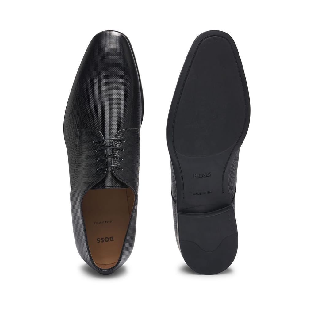 Timeless Derby shoes by BOSS, crafted in Italy from structured leather and fitted with a padded insole for elevated comfort. A minimum of 60% of the leather used to make this product has been sourced from certified tanneries.