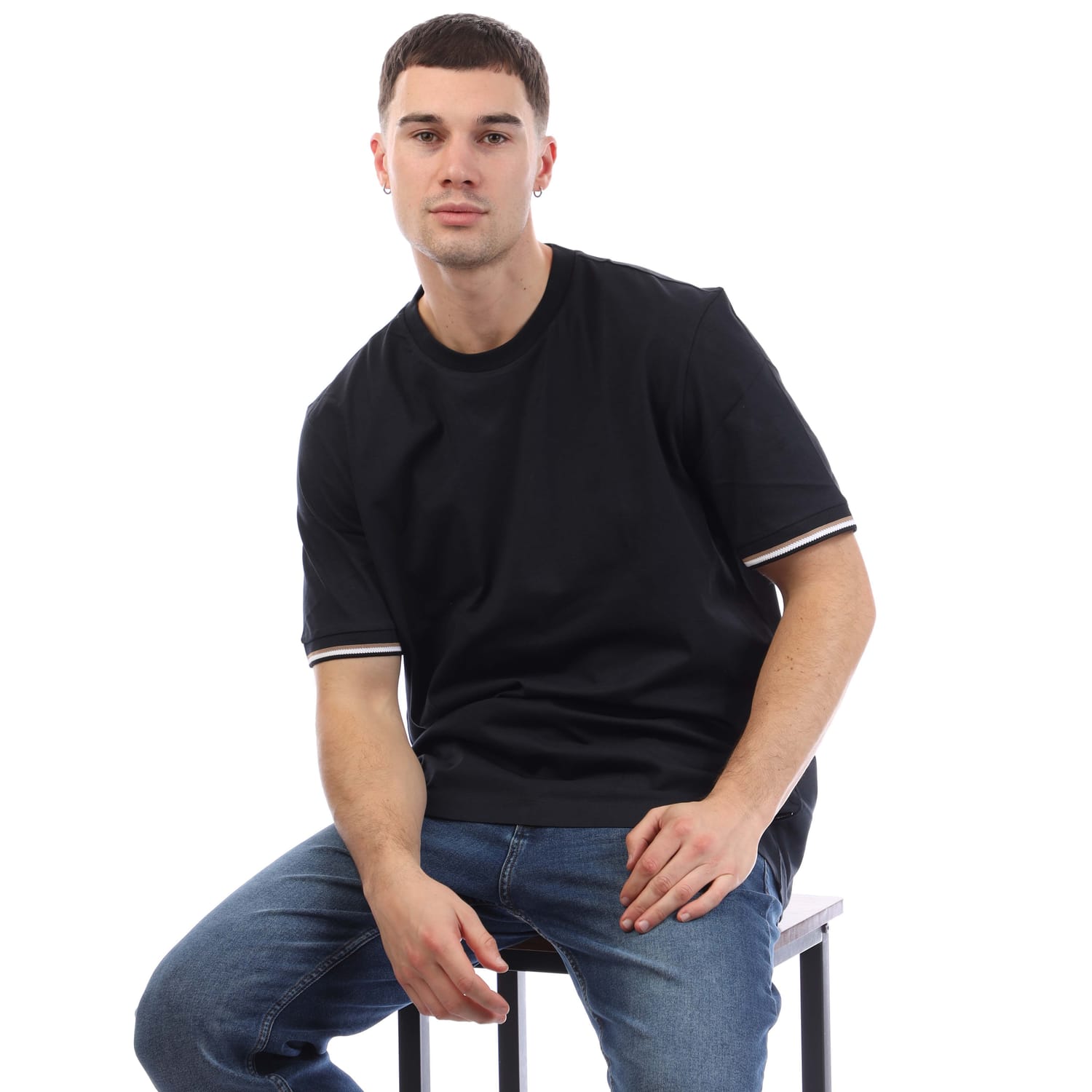 Mens BOSS Thompson Cotton Jersey T-Shirt with Signature Stripe Cuffs in dark blue