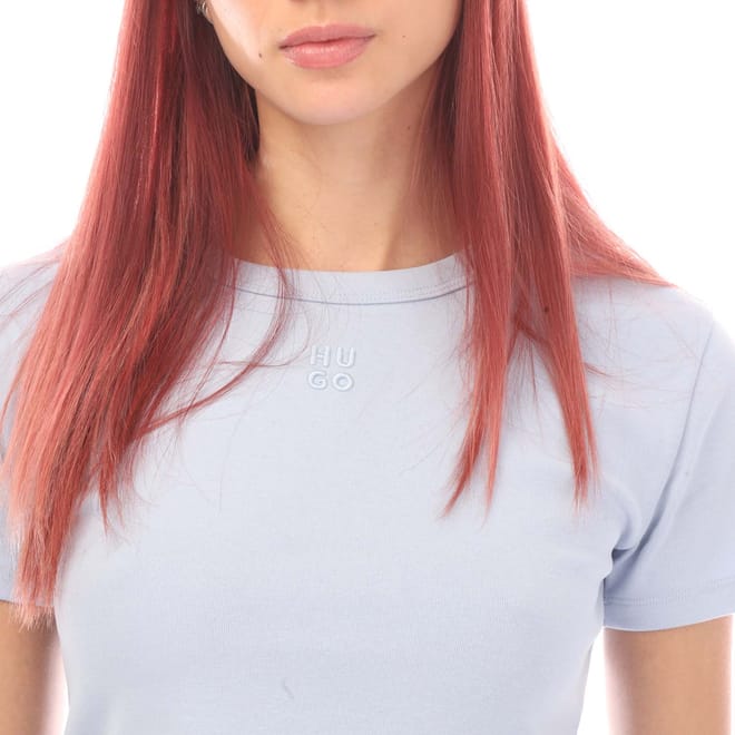 A modern essential, this HUGO Womenswear T-shirt has a cropped, slim fit with an embroidered stacked logo. Stretch cotton blend for comfort.