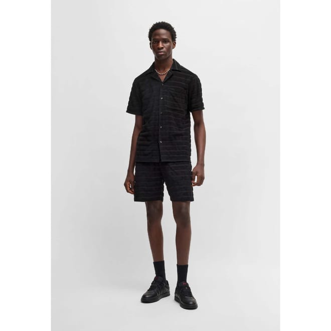 Designed to match the HUGO Menswear shirt, these shorts are made in breathable towelling with a horizontal stripe. Laid-back fit with adjustable waist.