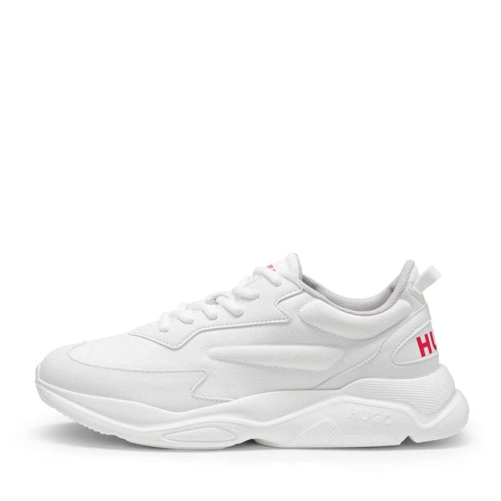 Round off casual looks with the sporty style of these HUGO Menswear trainers. Crafted in a mix of materials including canvas-effect fabric.