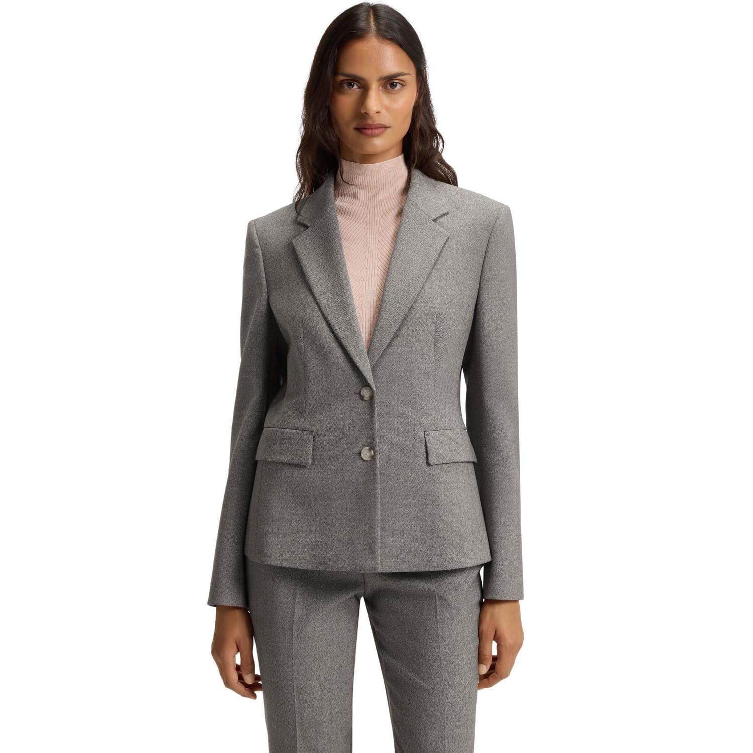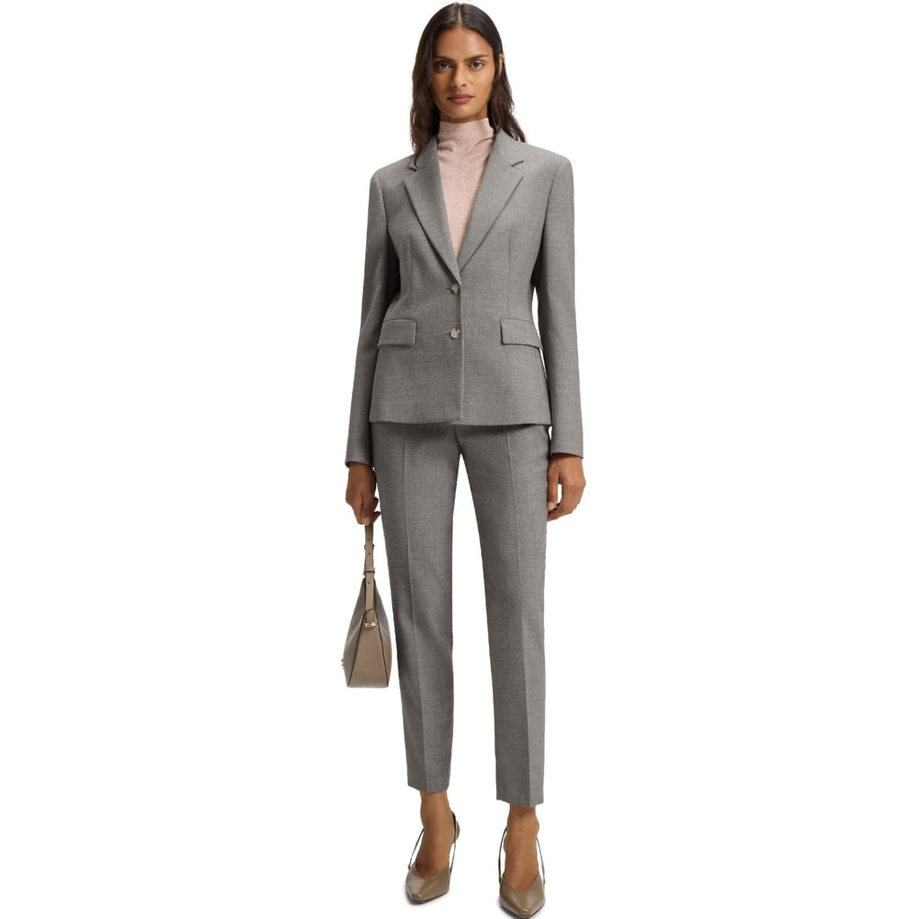 Woven with a subtle pattern, this BOSS Womenswear blazer is so easy to style. Wool-rich blend with stretch for comfort. Defined fit.