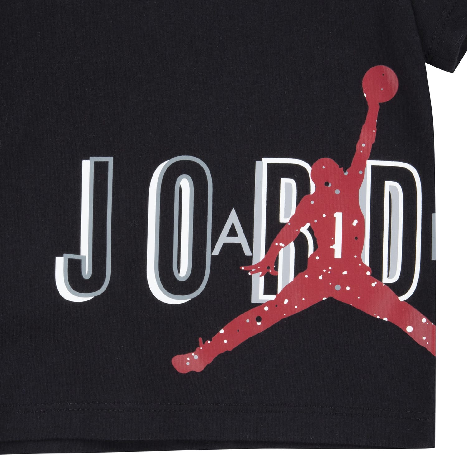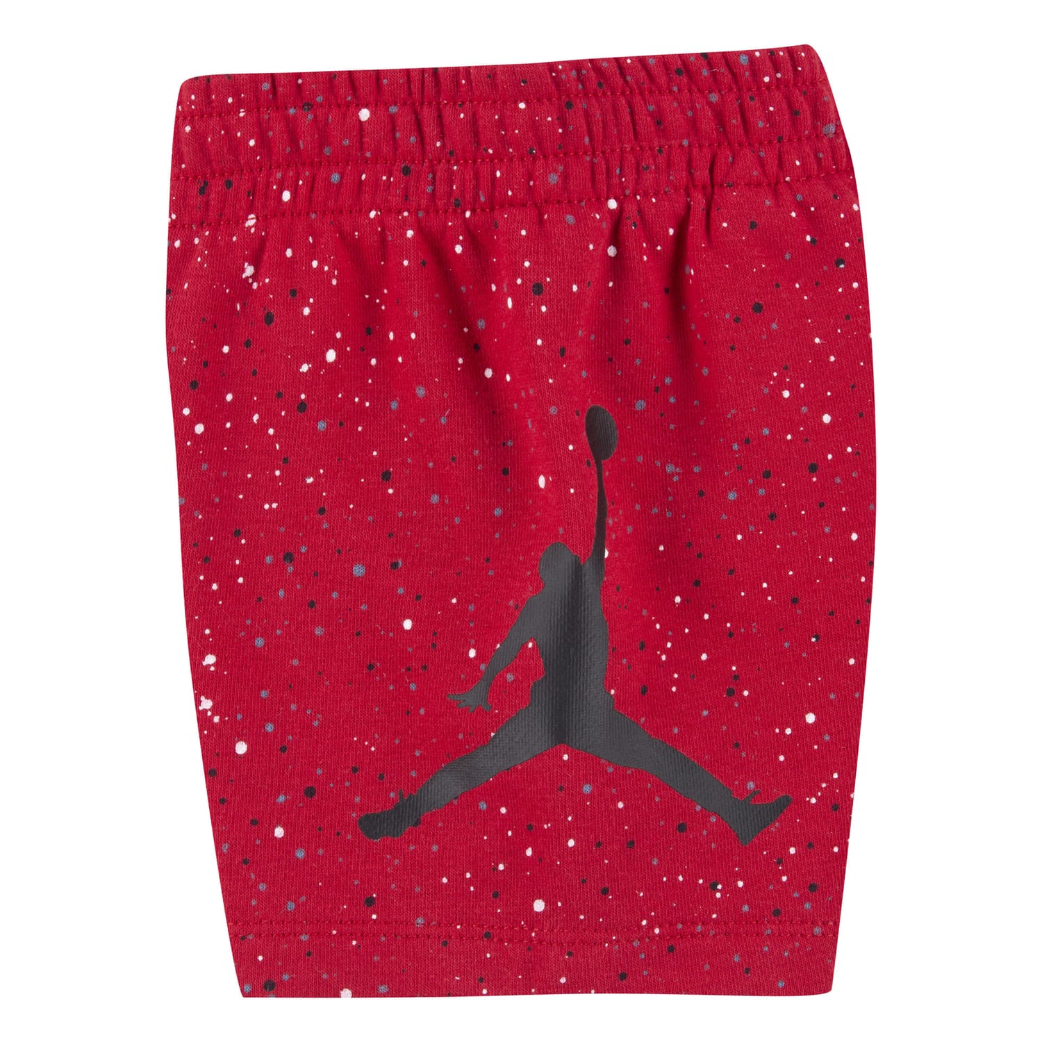 This two-piece outfit includes a black, short-sleeve T-shirt with a large "JORDAN" graphic and the iconic Jumpman logo, paired with red French terry shorts featuring an elastic waistband and a speckled print design. -