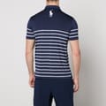 Polo collar. Two button placket. Short sleeves with ribbed cuffs. Striped pattern. Ralph Lauren signature embroidered pony and an official Wimbledon logo patch. Moisture-wicking properties for comfort. -