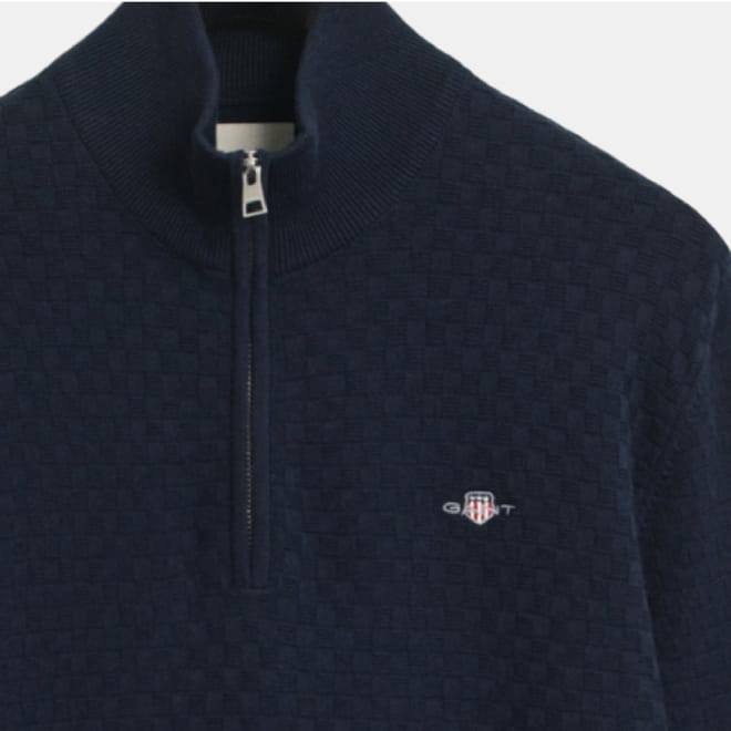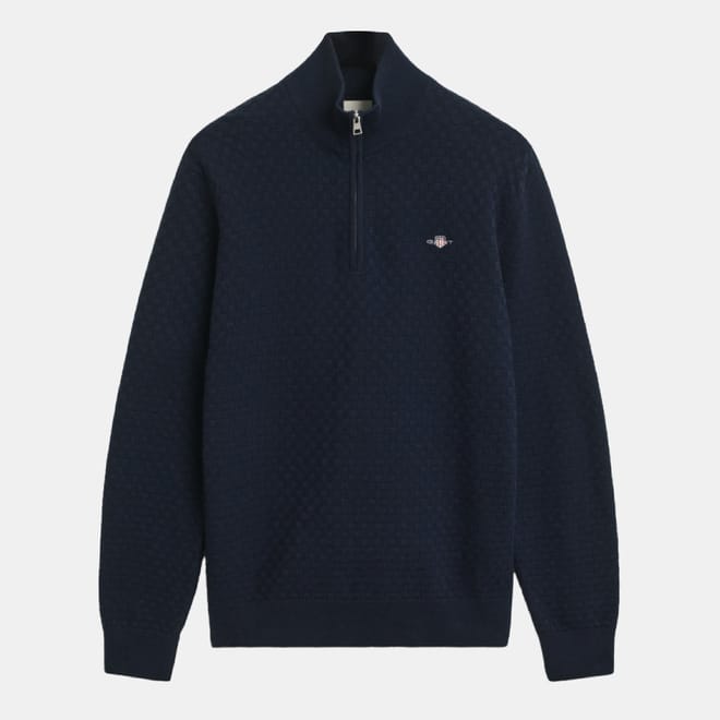 Made from textured cotton knit and tailored to a regular fit, this half-zip sweater boasts an embroidered GANT shield graphic on the chest. It's an ideal layering piece for year-round wear. This product is made with a majority of organic cotton. Organic cotton reduces the environmental footprint and promotes safe work and better livelihoods. -