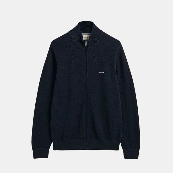 Full-zip front, ribbed detailing at the collar, hem, and sleeve cuffs. A classic GANT logo is embroidered on the chest. Made from 100% cotton in a piqué knit structure, offering breathability and comfort. -
