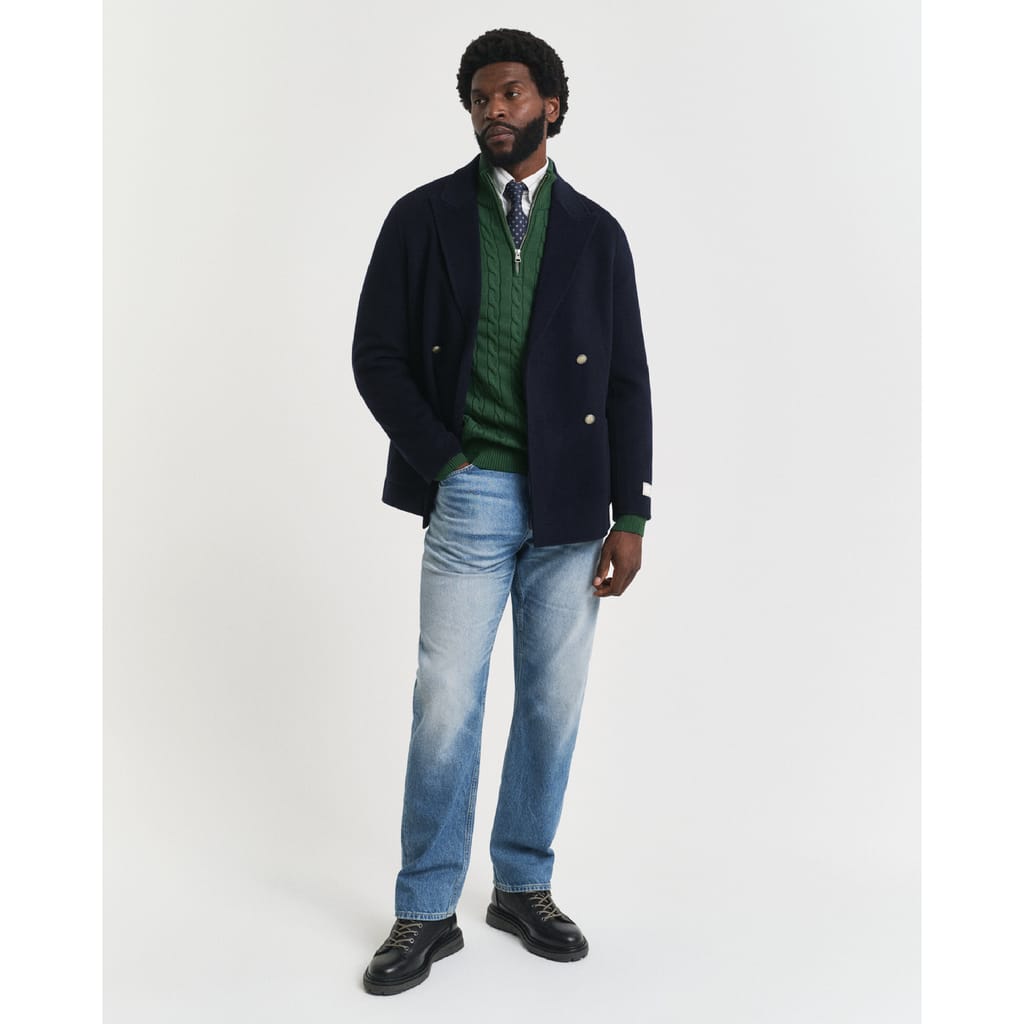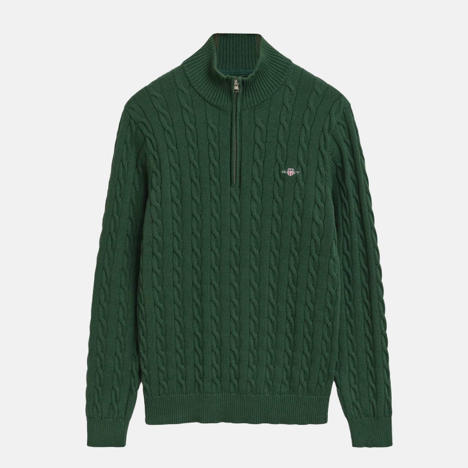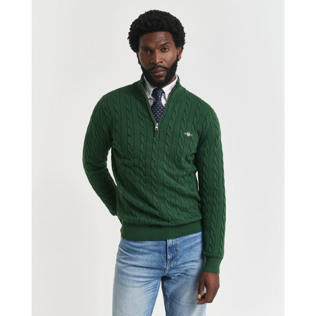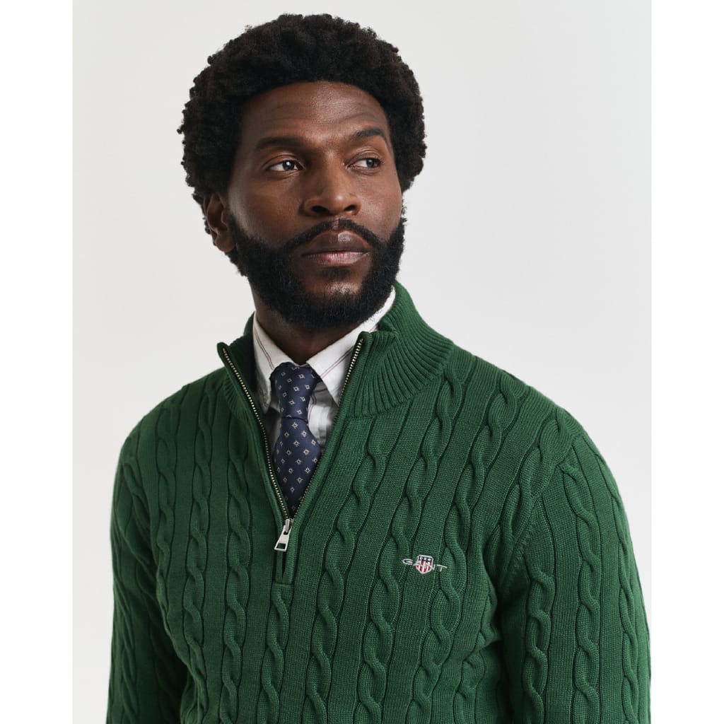 A preppy piece for any modern wardrobe, this GANT sweater is designed with traditional cable-knitting. Crafted from 100% cotton, it has a regular fit with a sporty half-zip collar, ribbed detailing at the hem and cuffs, and a GANT shield graphic embroidered at the chest. Style with denim and tailoring. -