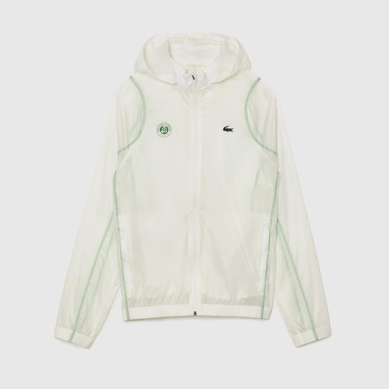 - Iconic Lacoste green crocodile logo and the official Roland Garros logo on the chest.