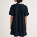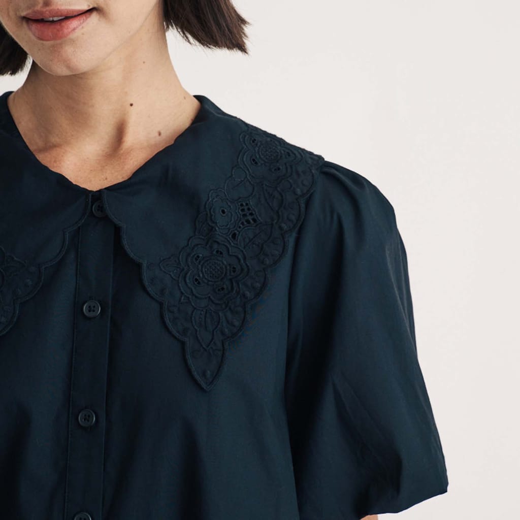 "Oversized collars are having a moment. Made entirely from light organic cotton poplin, this black mini comes with blouson sleeves and a so-now collar that’s flourishing with a subtle embroidered floral design. Pair with your best black boots. • Drop collar • Mid-length blouson sleeves • Button front • Oversized fit" -