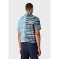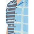- Striped pattern with text accents, the right side displays a light blue and yellow check pattern.