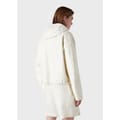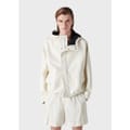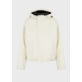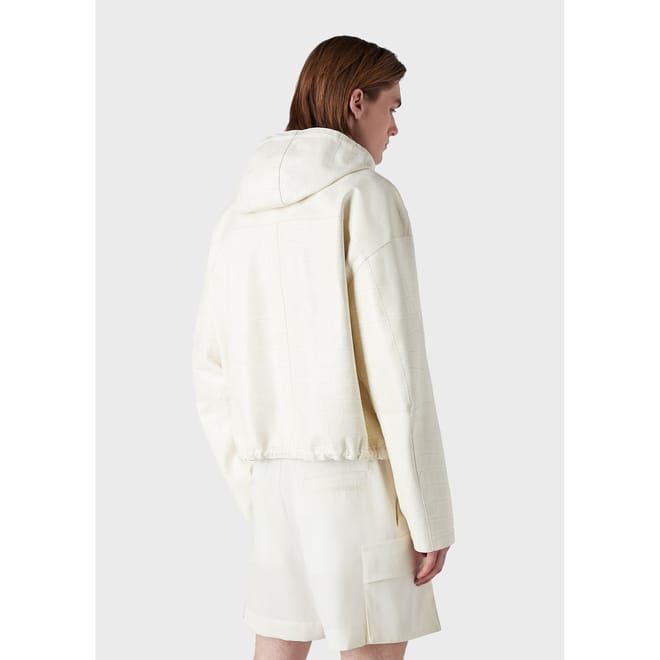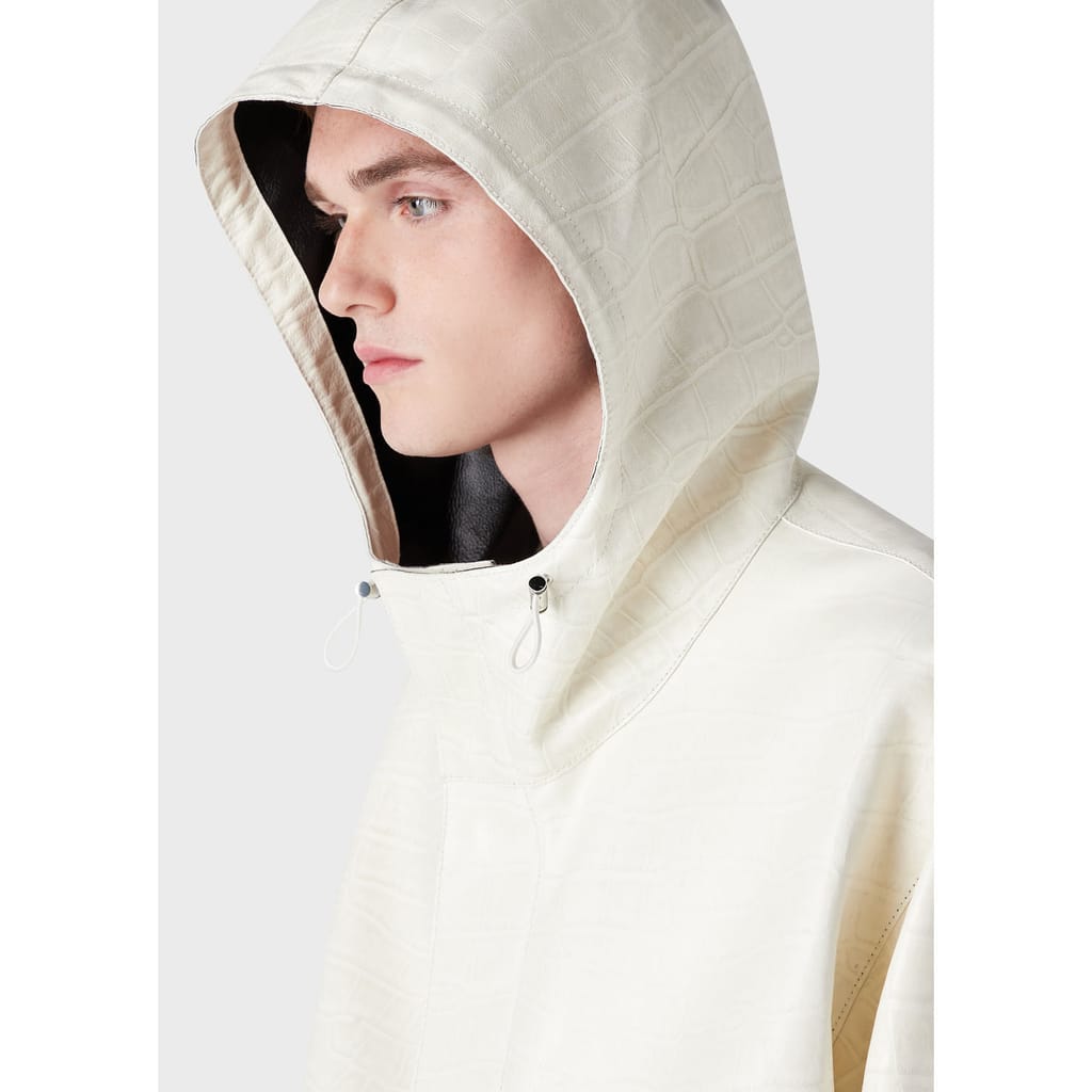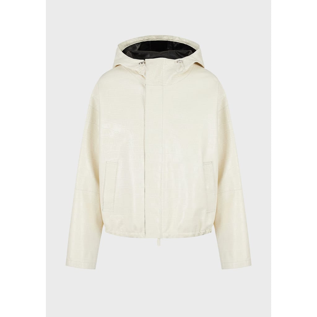 Hooded jacket with a black inner lining.