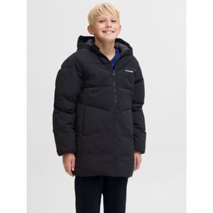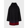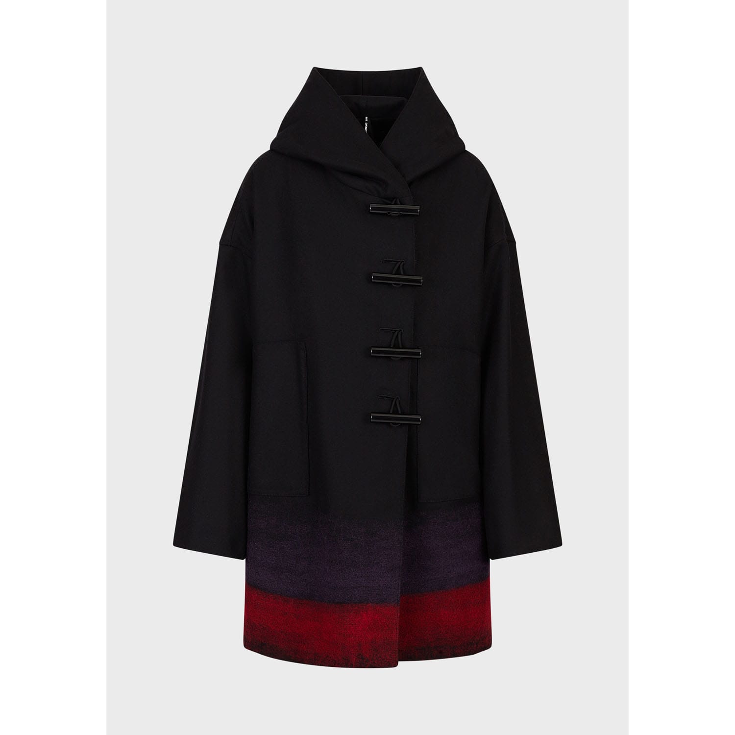 Duffel-style coat with toggle buttons and a hood. The bottom portion of the coat features a color-block pattern with shades of purple, dark red, and black. -