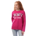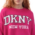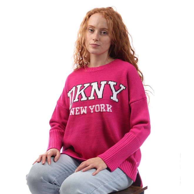 Womens DKNY Varsity Logo Intarsia Crew Neck Knit Sweater in pink purple.