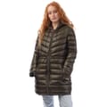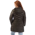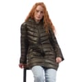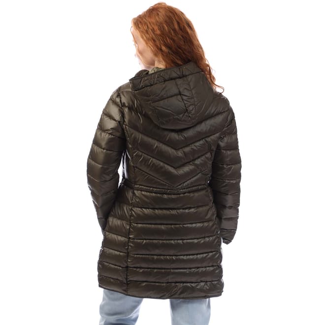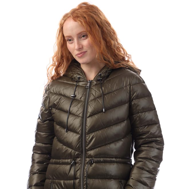 Womens DKNY Zip Front Puffer Jacket With Cinched Waist in grey / green.