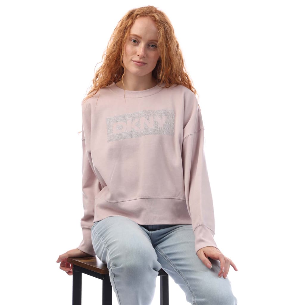 Womens DKNY Rhinestone Crosswalk Crew Sweatshirt in white / pink.