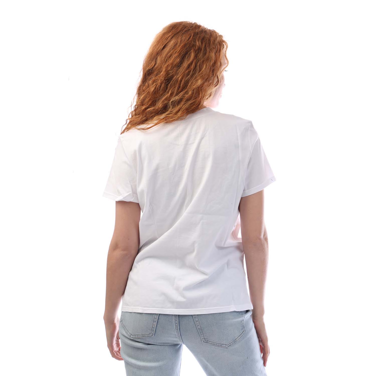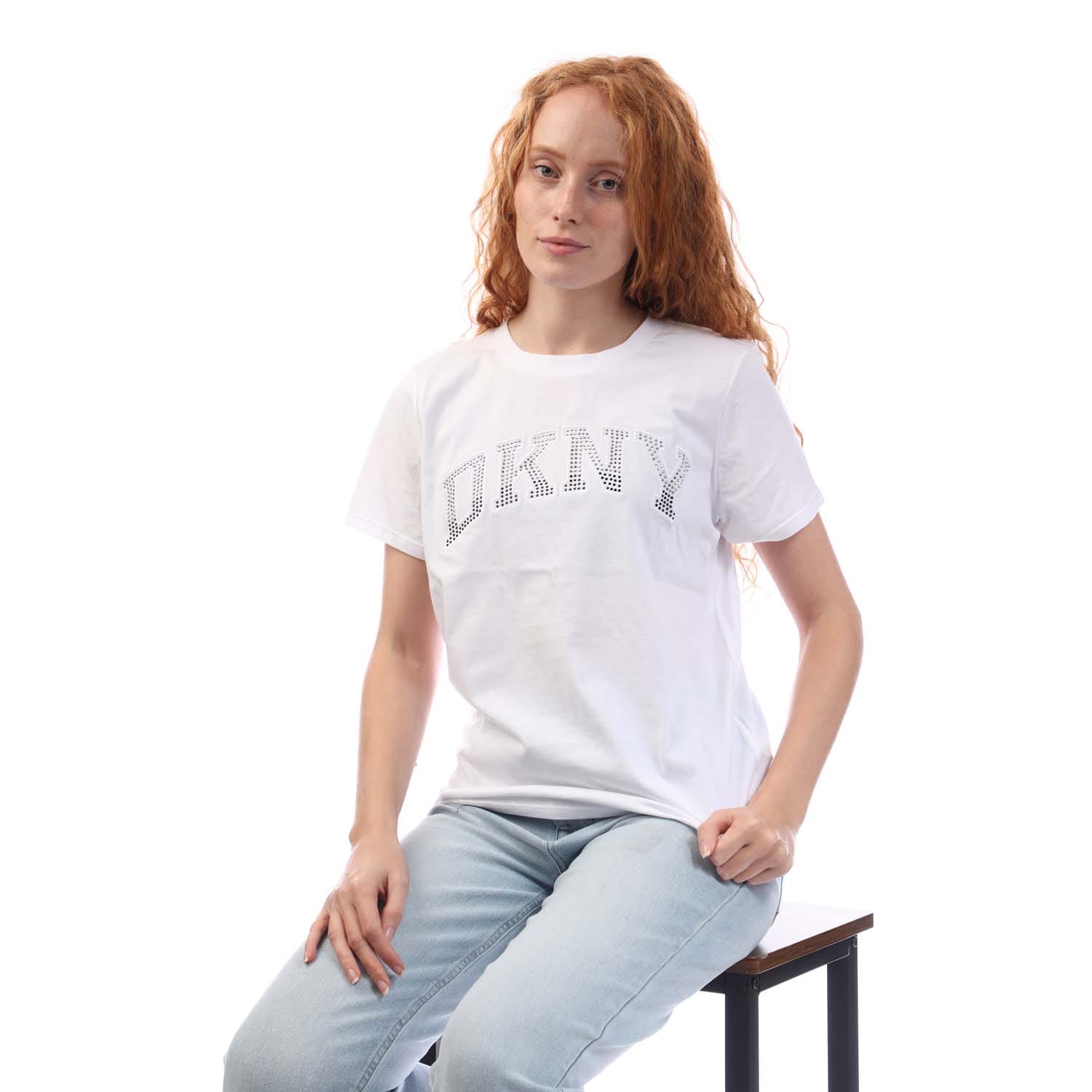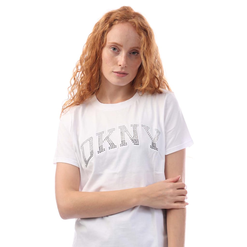 Womens DKNY Arched Varsity Rhinestone Logo T- Shirt in white silver.