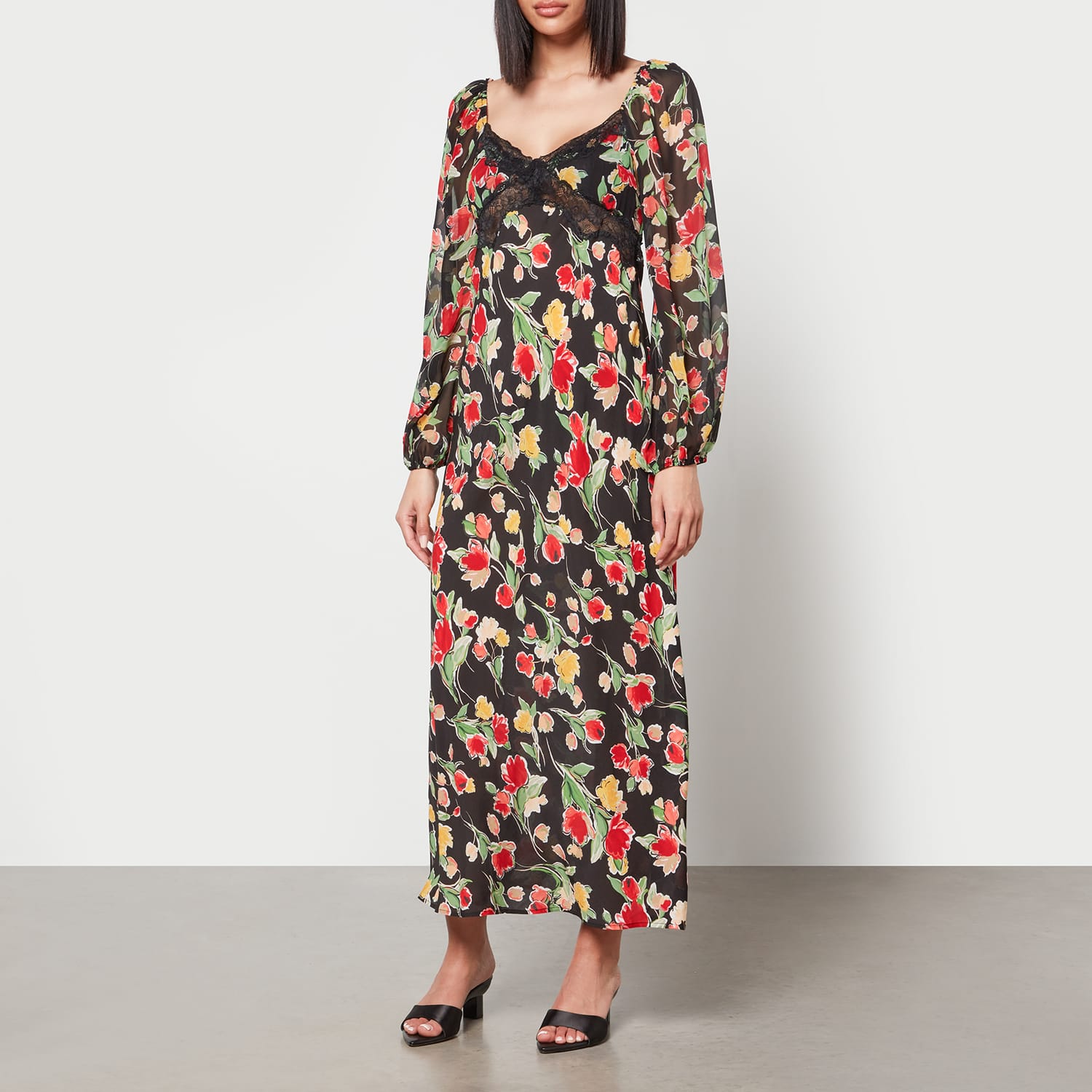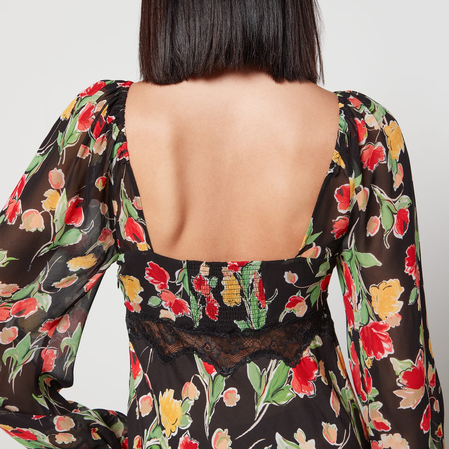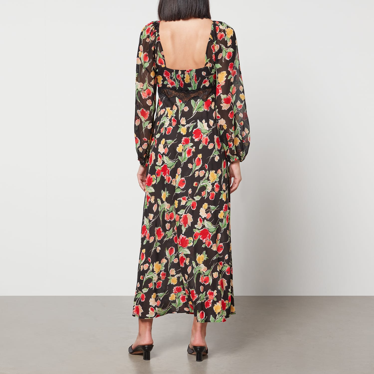 Hand-painted floral print inspired by a trip to Goa. It is a long-sleeved midi dress featuring a V-neckline with a velvet trim, an empire waist, and blouson sleeves with buttoned cuffs. The dress is designed with a bias cut for a fluid drape that flatters the body. -