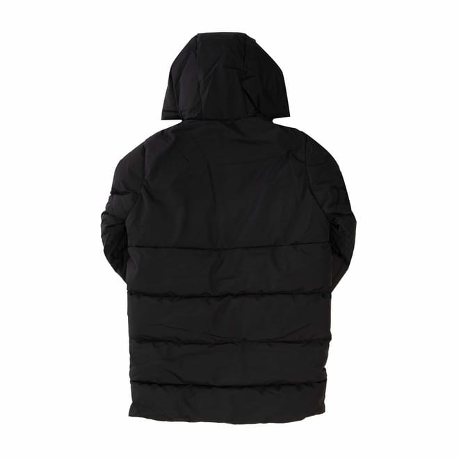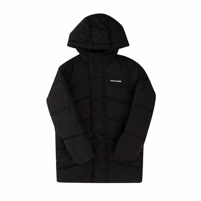 Boys Jack and Jones Otis Long Puffer Hooded Jacket in black.