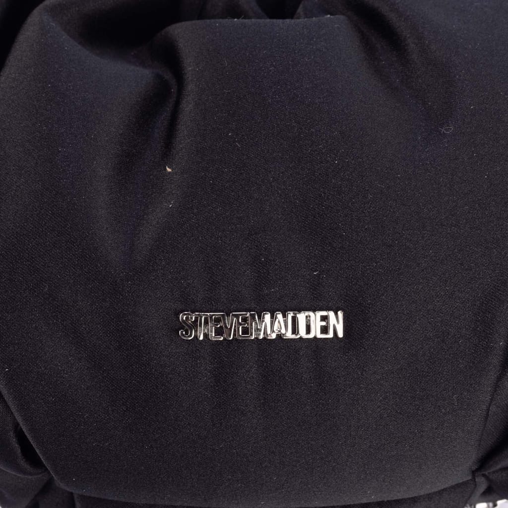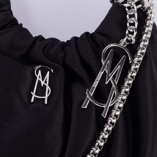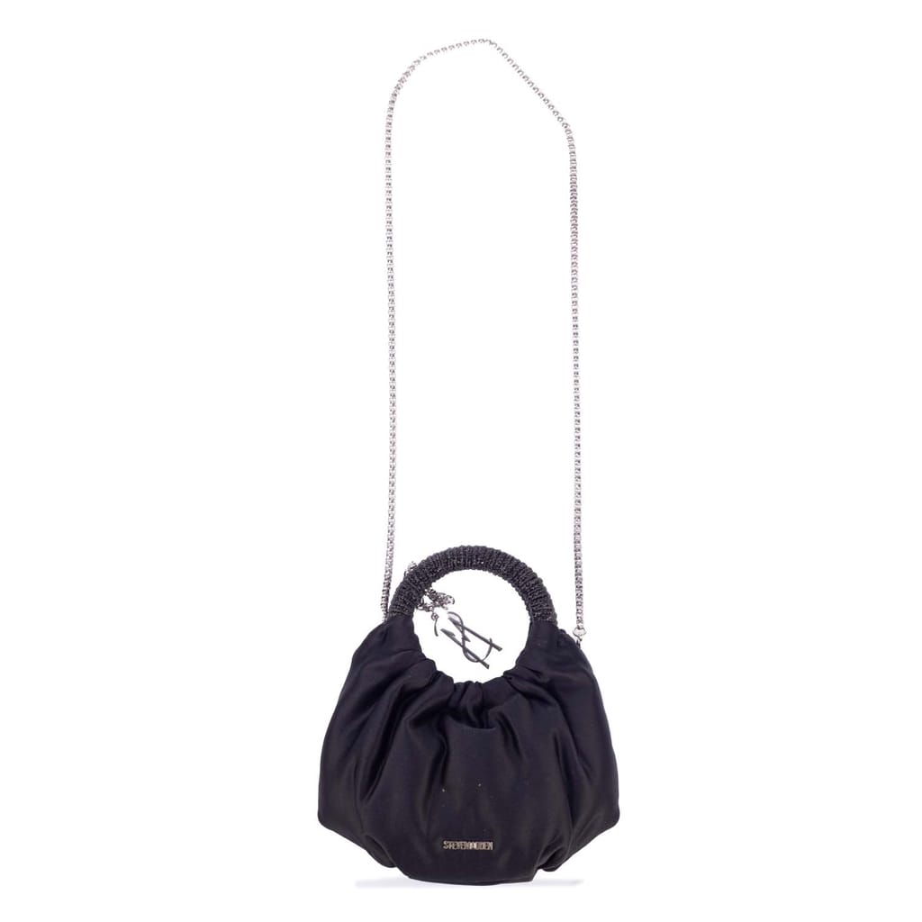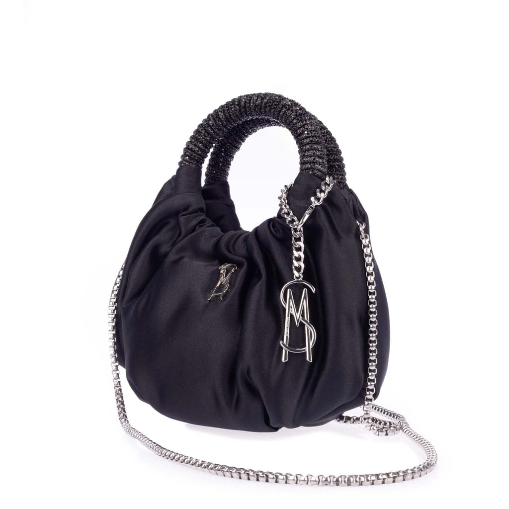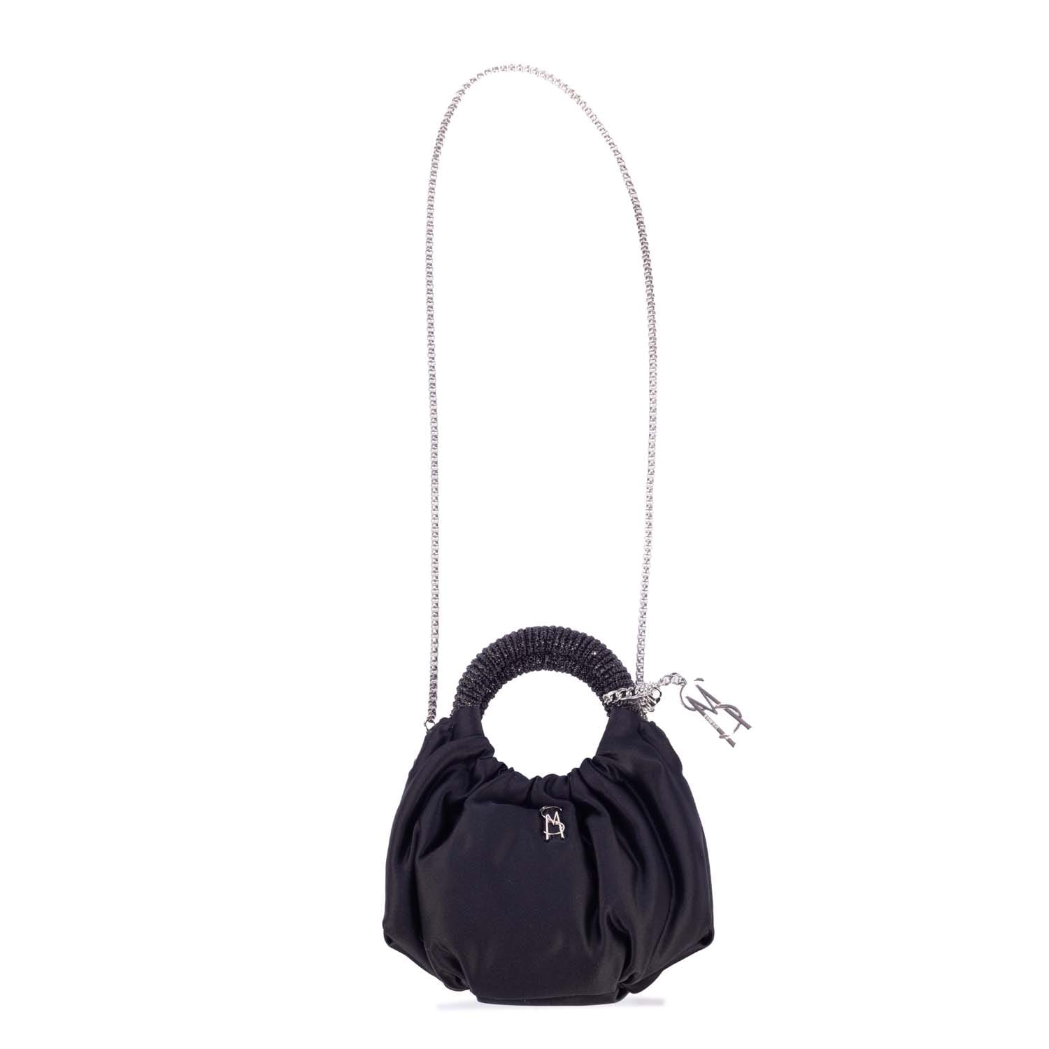 It features a ruched body, a rigid circle top handle, and a detachable chain crossbody strap. -
