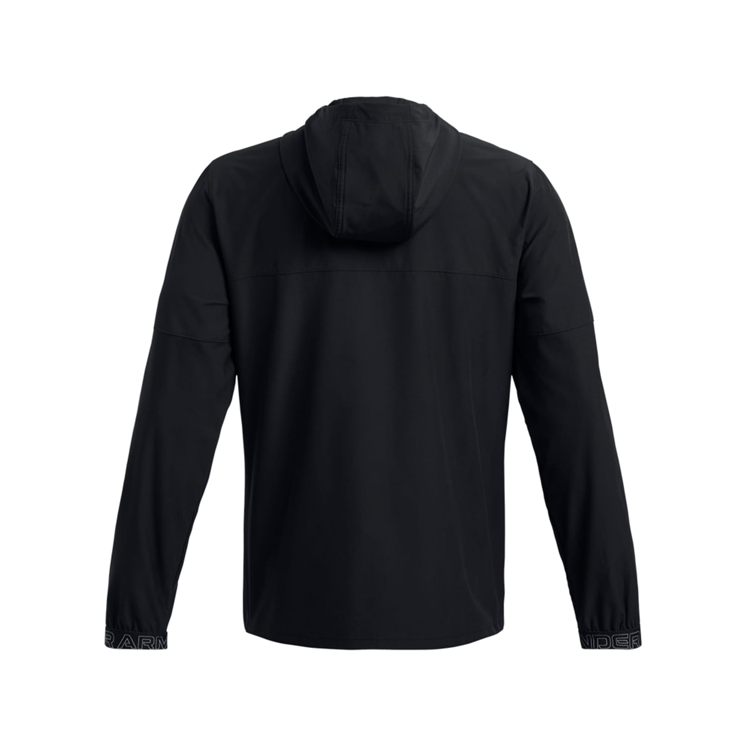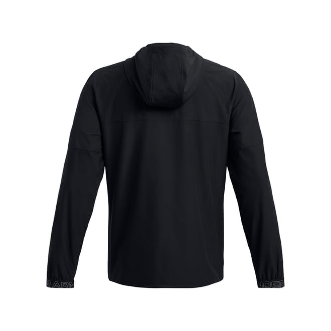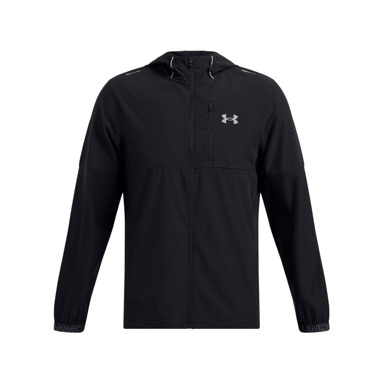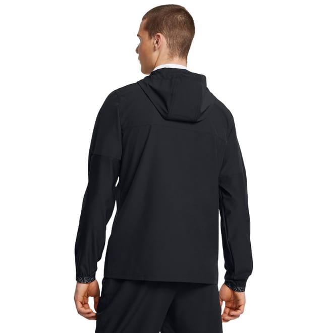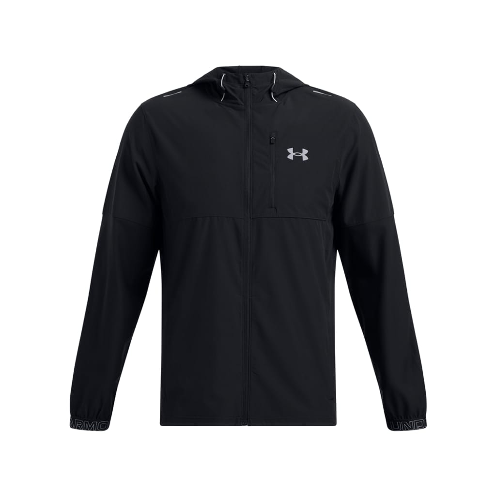 A full front zip fastening with an adjustable hood and a high collar. Reflective straps are featured on the shoulders. Long elasticated cuffs on the long sleeves featuring the signature Under Armour logo printed in white. Two zip entry pockets situated at the waist and one zip entry pocket on the left chest with the signature Under Armour logo rubberised in white. -