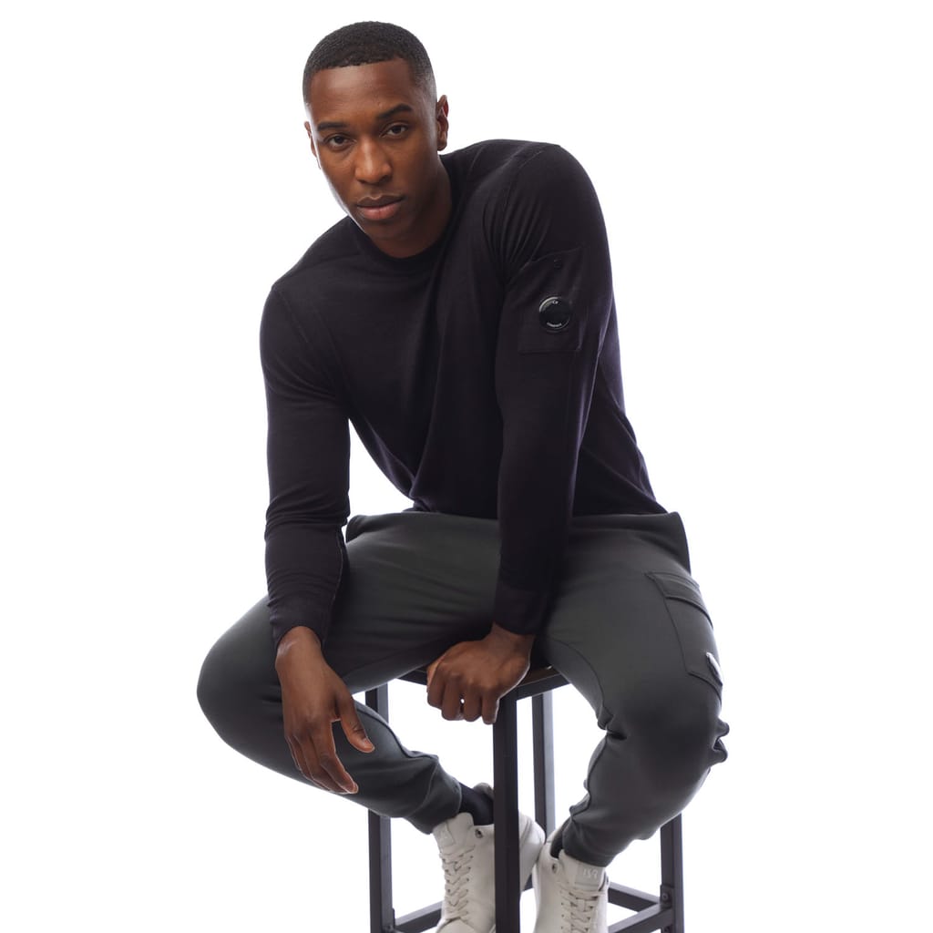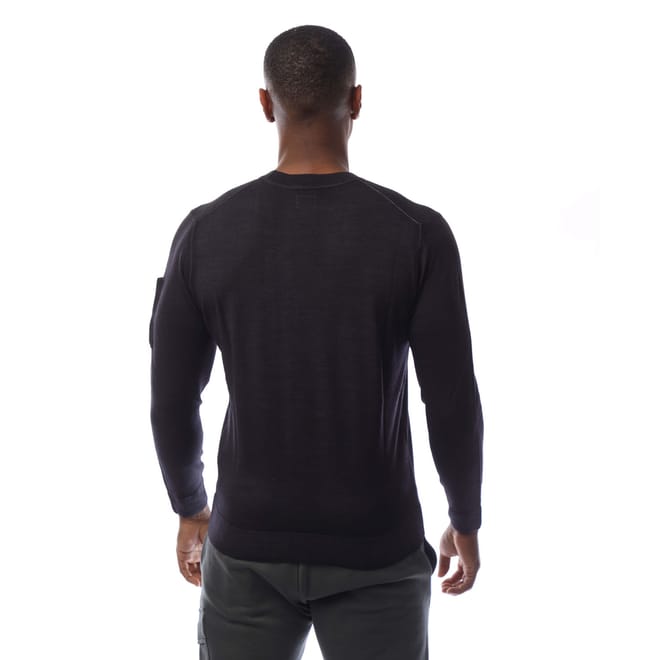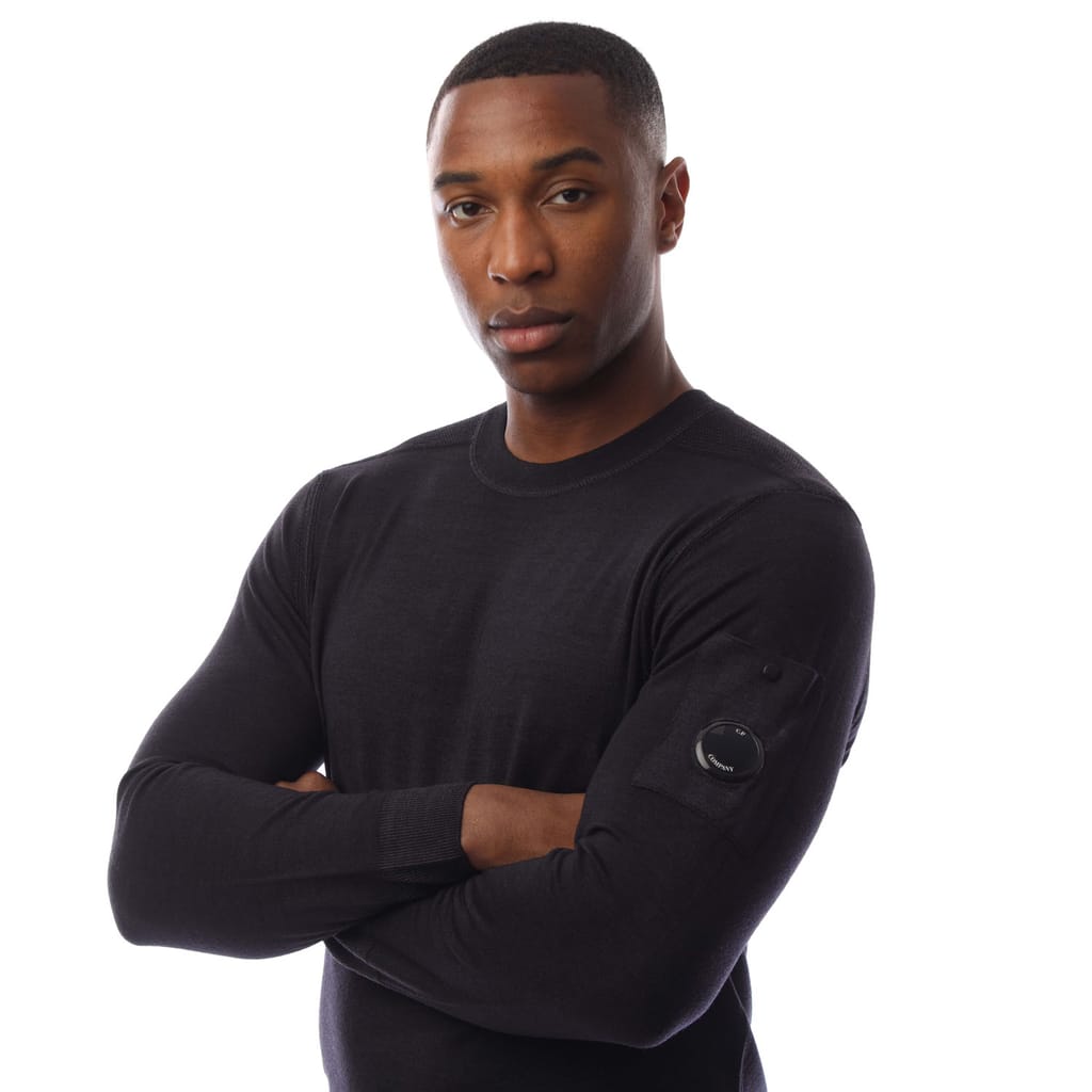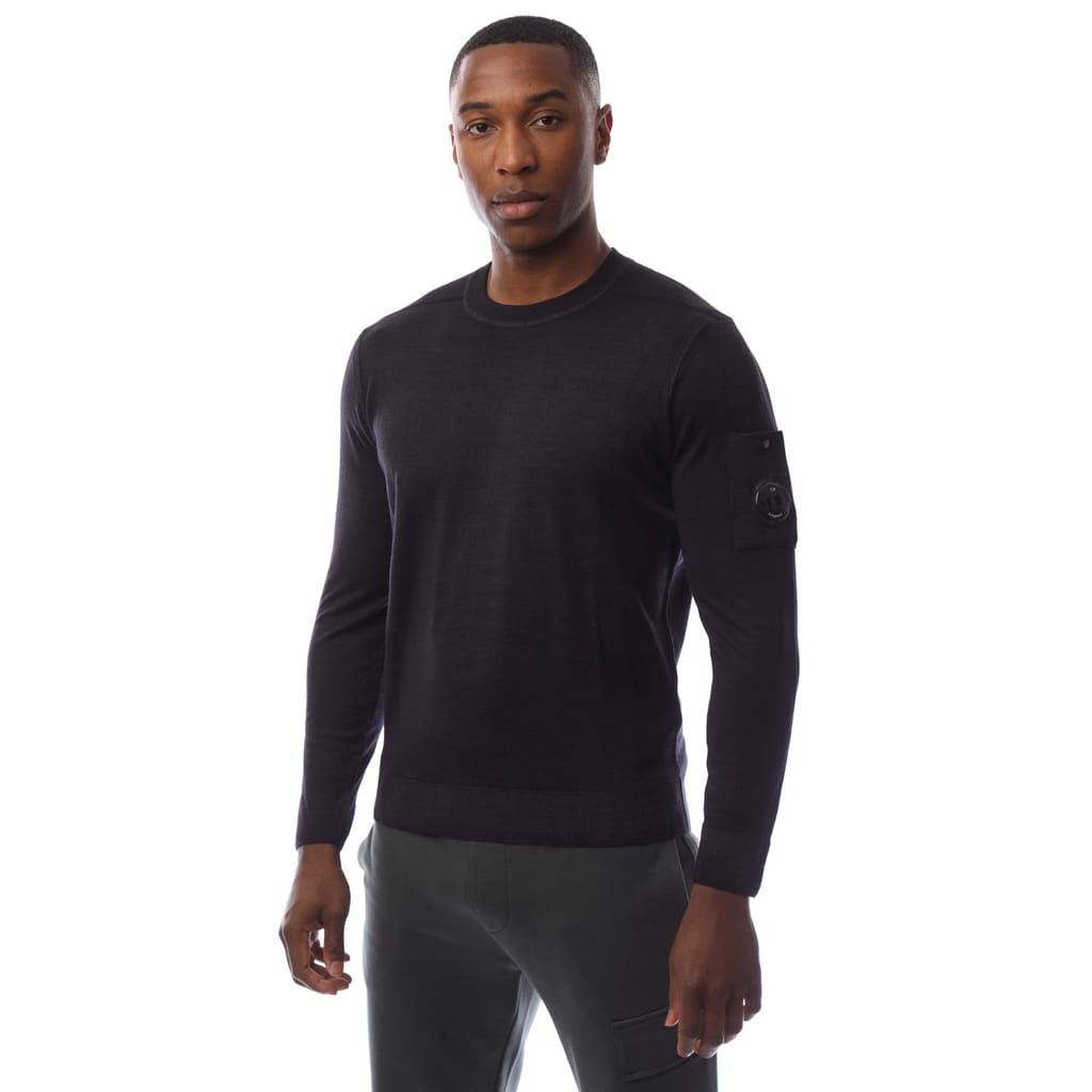 Mens C.P. Company Merino Wool Lens Crewneck Sweater in navy.